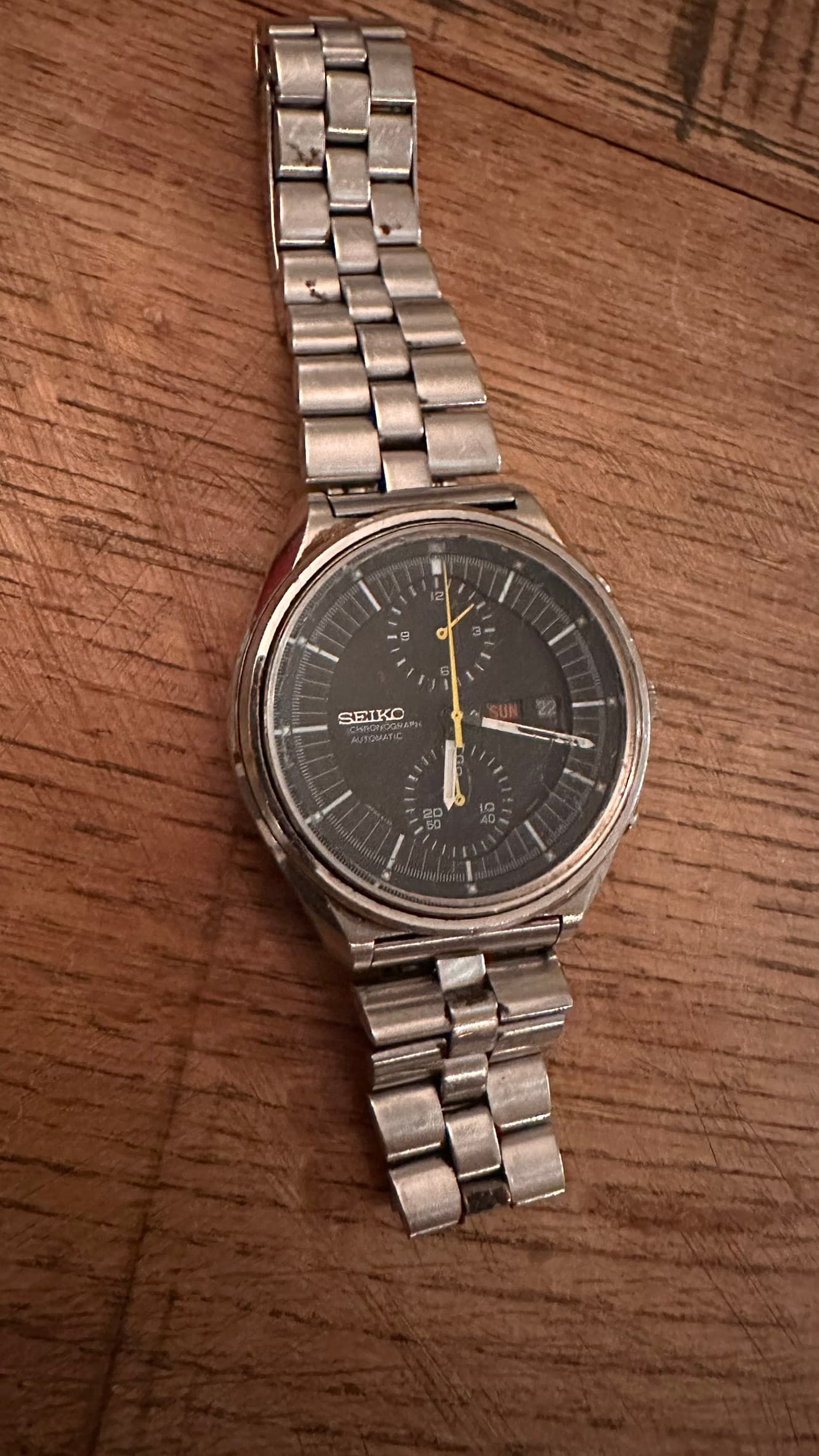 Ook kwam de Seiko van mijn vader uit deze doos tevoorschijn. Model 6138-3002 (Jumbo). Ik zag deze hier op het forum ook al eens voorbij komen. Begin jaren '70 is het model volgens mij ? Deze automaat wil nog wel lopen zo te zien, echter is de band voor mij spijtig te strak. Zover ik weet is er geen schakel tussenuit. Op internet al gezocht naar foto’s om het aantal schakels te tellen en te vergelijken. Er is weinig materiaal nog voor te krijgen heb ik zover begrepen. Een nieuwe band vind ik eigenlijk weer zonde, gaat de originaliteit weer een beetje weg. Maar eens even goed over na denken. De grote wijzer mist ook spijtig het fluor materiaal.