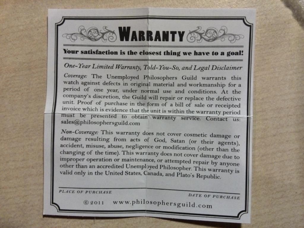 Het horloge op zich is namelijk al niet heel erg serieus met de benen van monty pyton als wijzers, maar er zit ook een leuk garantiebewijs(je) bij. Hierop staat dus o.a. dat ze geen garantie geven op daden van god satan of diens agenten en meer van dat soort onnozele dingen. Ook staat er op de achterkant van het horloge: “For best results, use other side.” Al met al vind ik het wel leuk bedacht van ze en het is natuurlijk ook gewoon een leuk horloge. Het horloge is uiteraard op zich niet veel speciaals, gewoon een simpel japans quarts uurwerkje met een chinese kast.