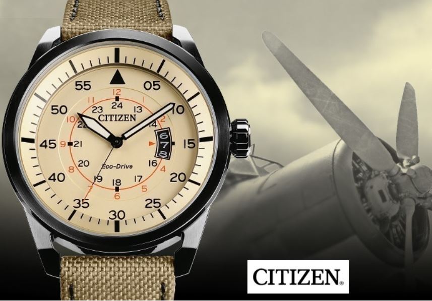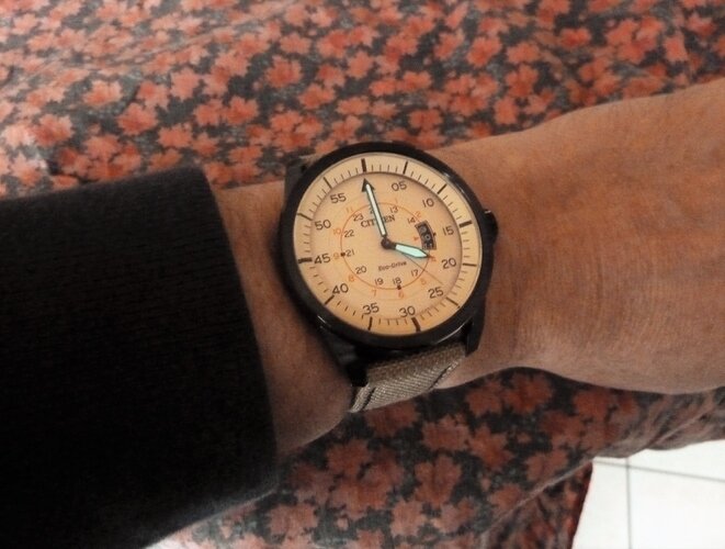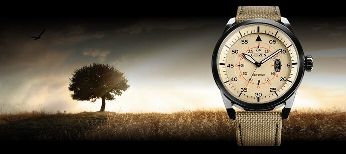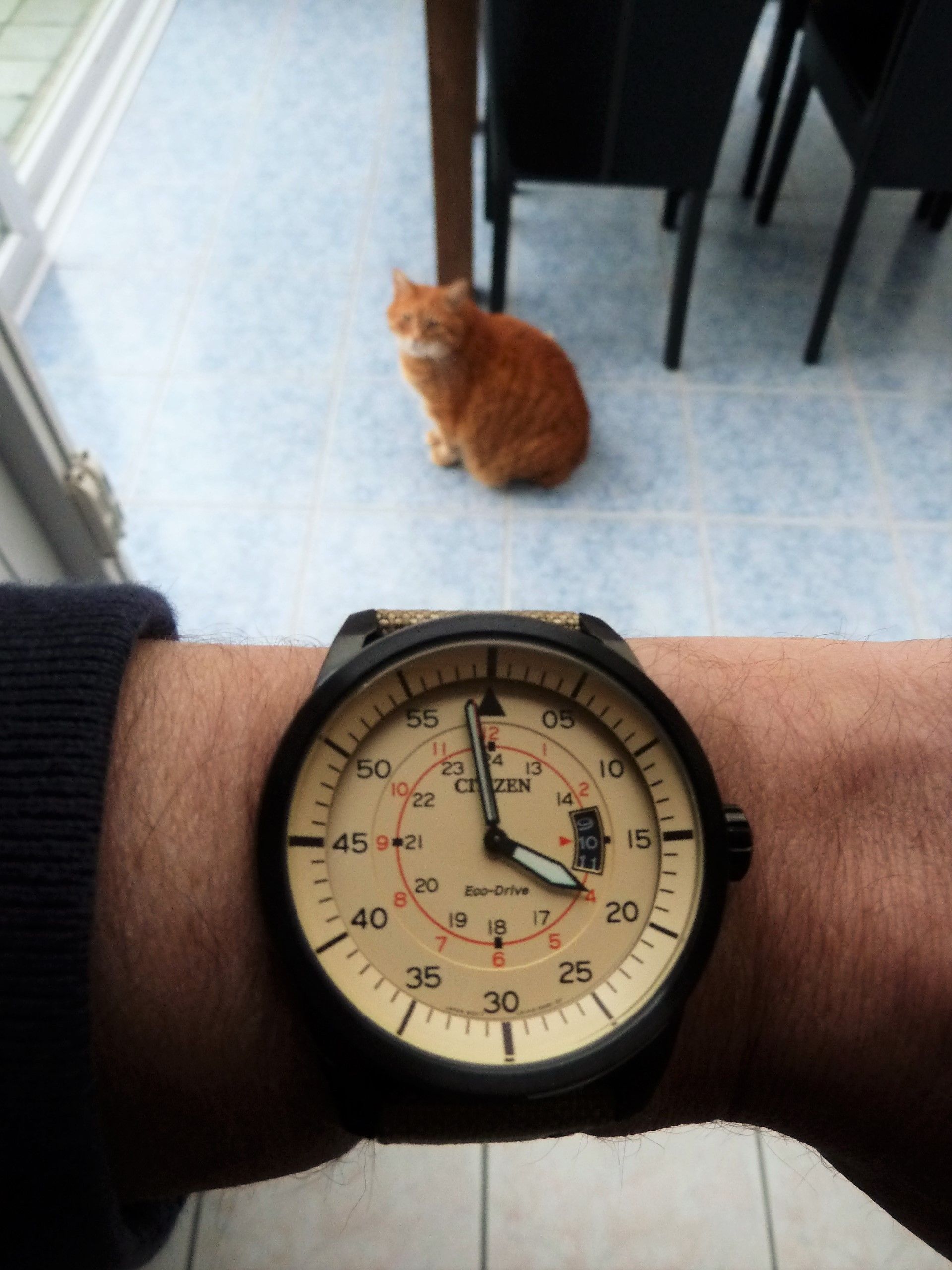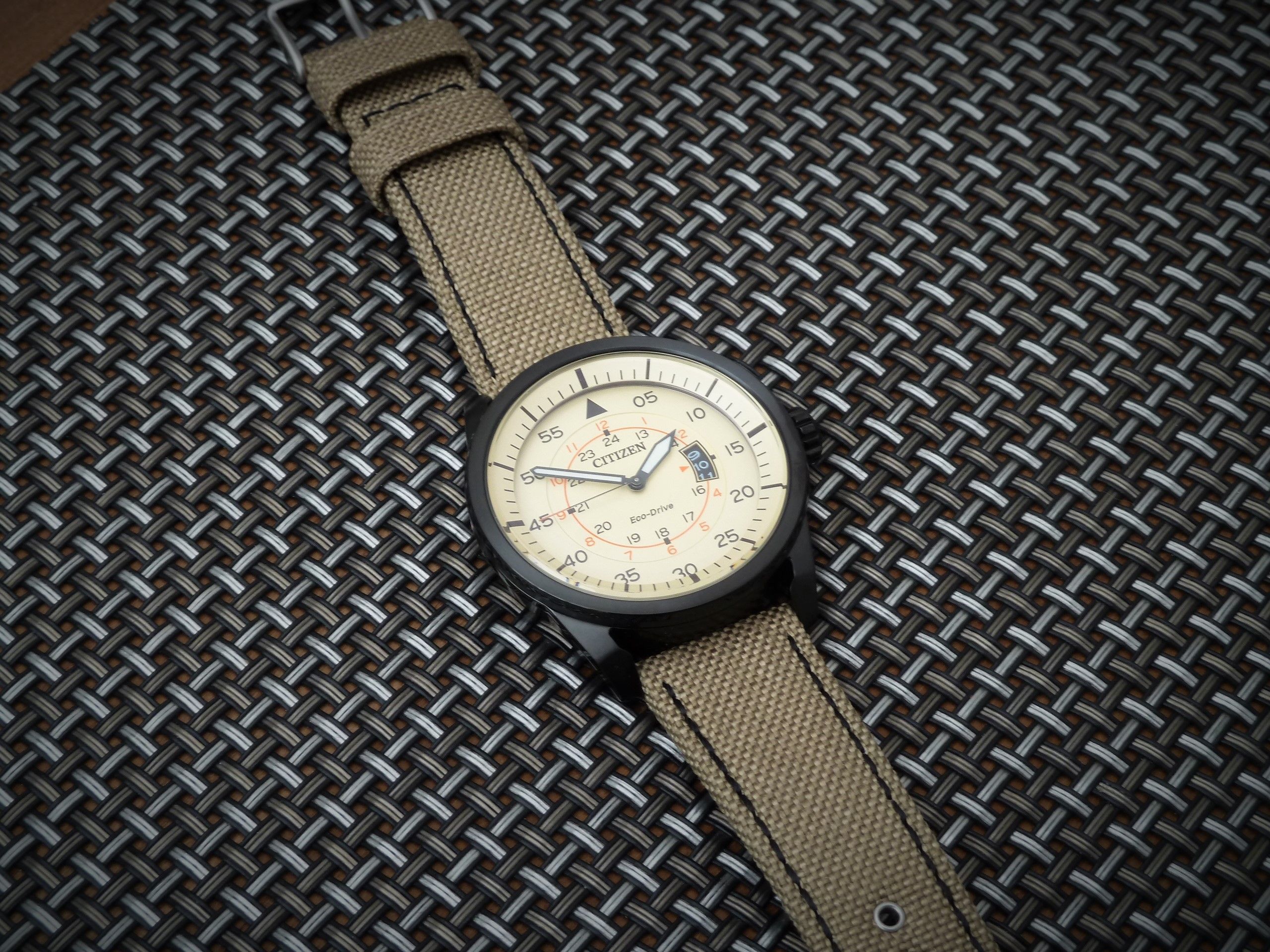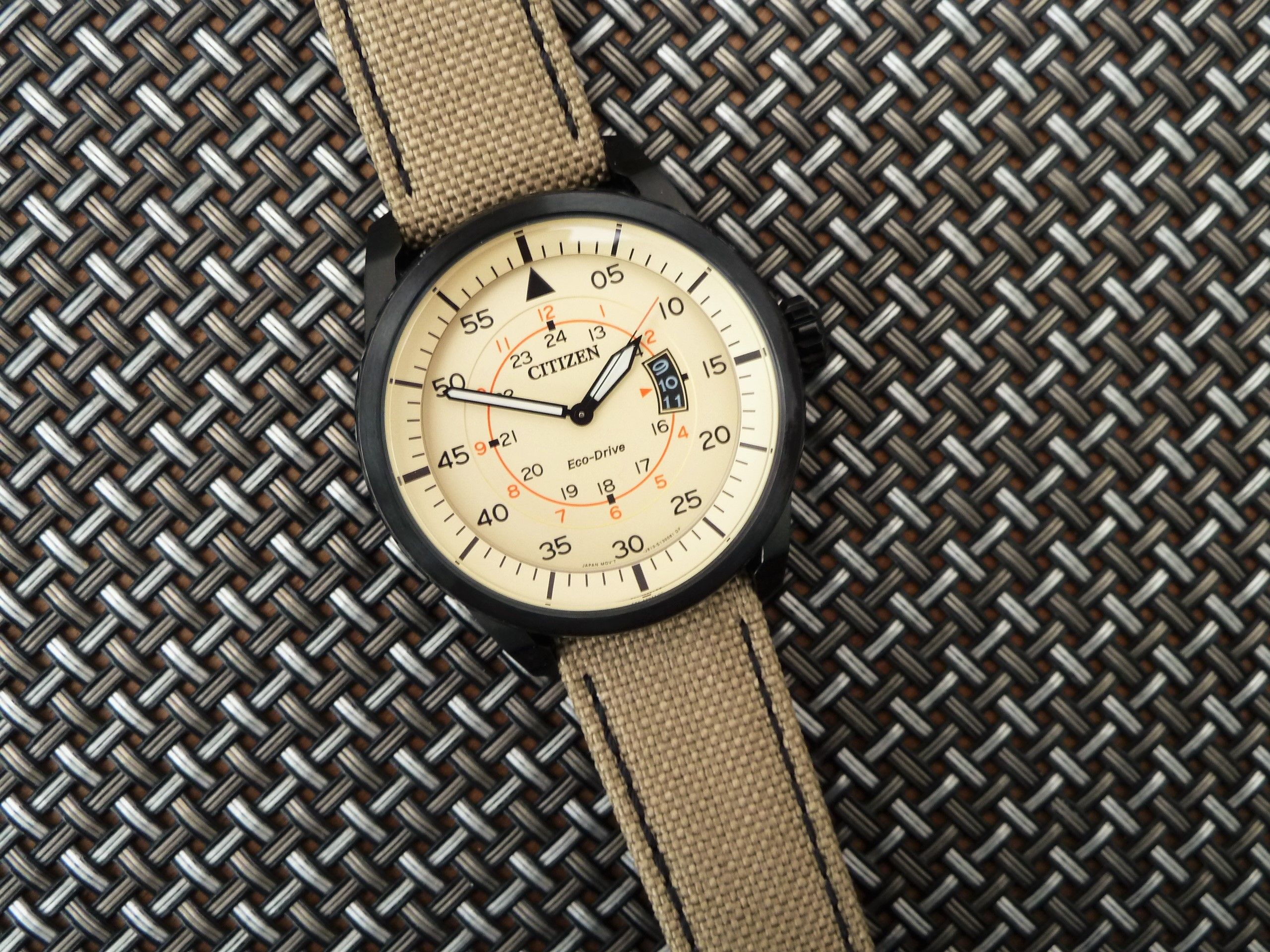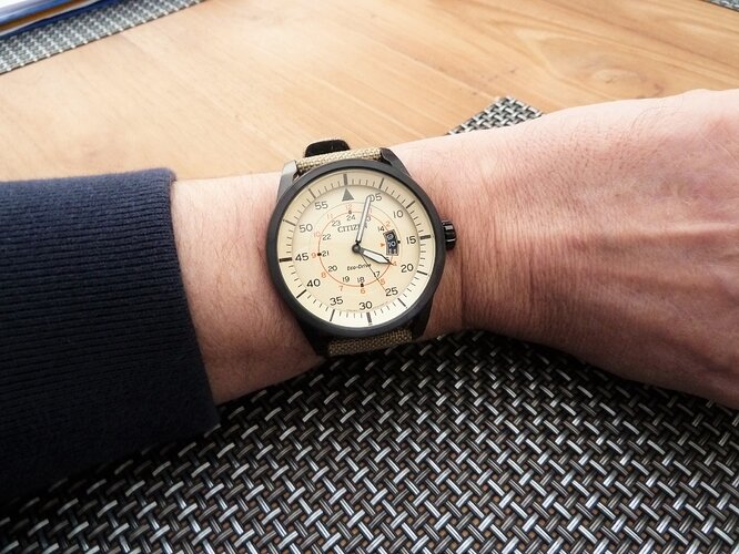 Ik kijk al een tijdje uit naar een solar of eco-drive toolwatch en zodoende bij dit beige-zandkleurig exemplaar uitgekomen, de Citizen Aviator AW1365-19P.