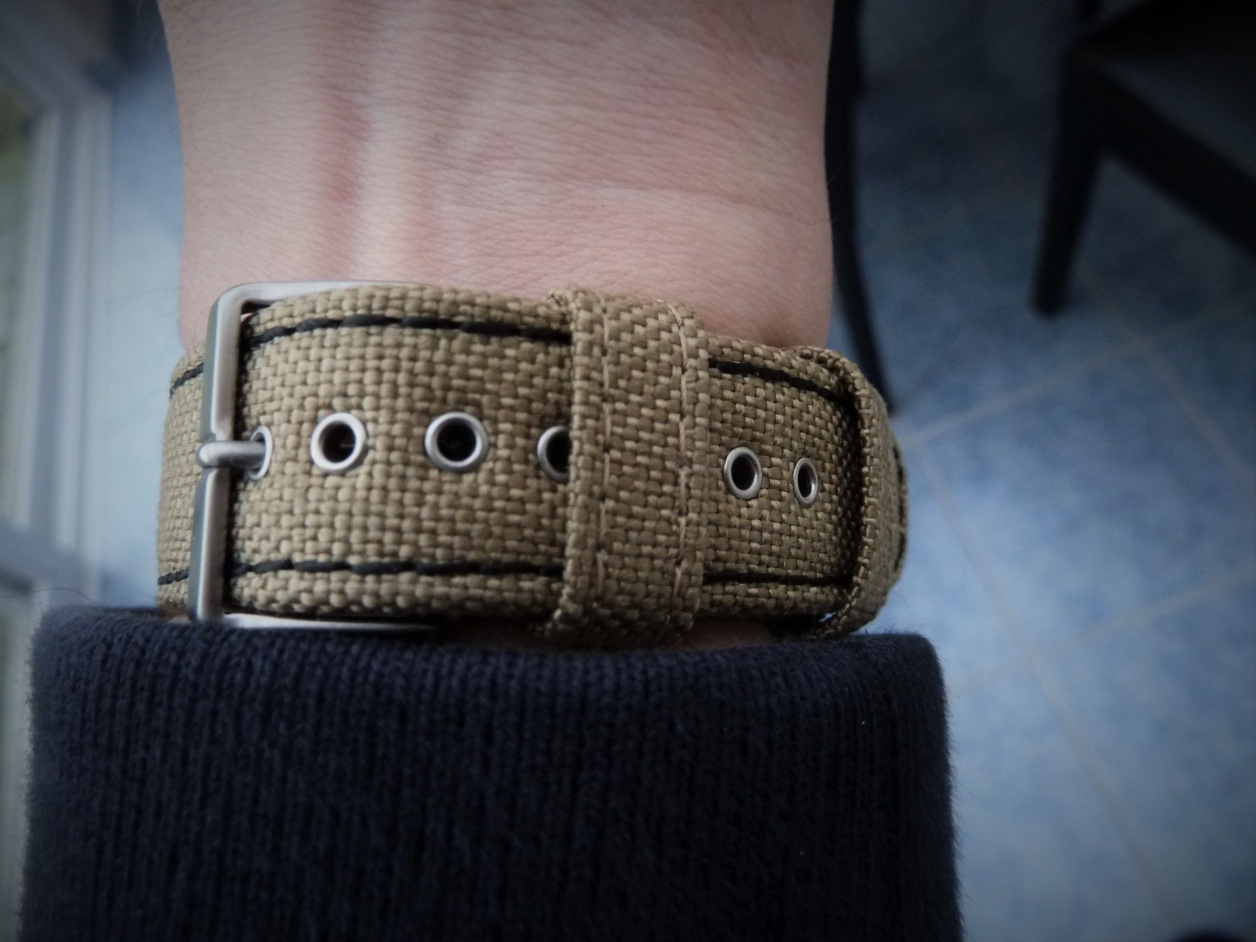 Vind ik ook, maar ze schijnen nogal stug te zijn, de meesten op de fora vinden het maar niks kwa draagcomfort. Ach, voor hetgeen dit horloge maar kost kunnen we natuurlijk niet te veel beginnen zeuren… Een mooie nato of andere horlogeband is snel gemonteerd