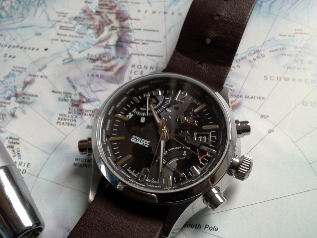 Als je dan zo’n “stoere” klok hebt, kan ie eigenlijk niet met een leren bandje vind ik.