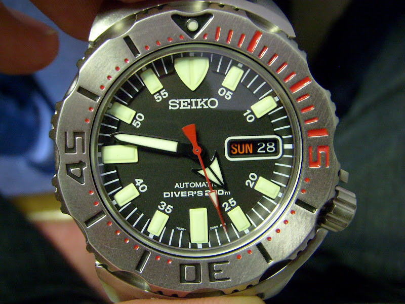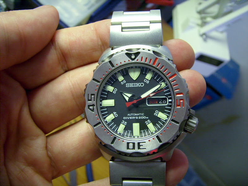 Wijzers van de oranje, rode seconde, saffier, beadblasten. En een spatje verf op de bezel.