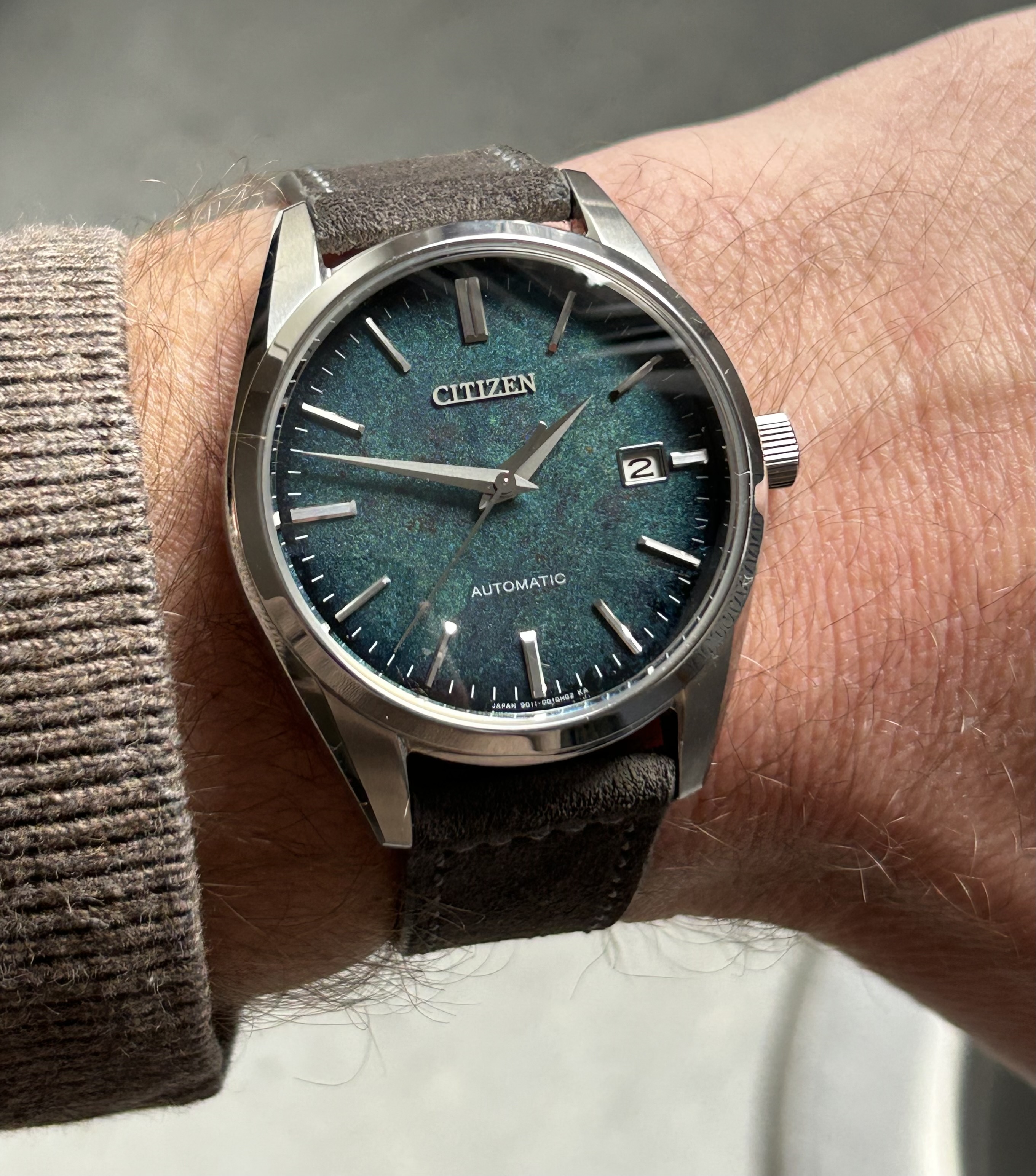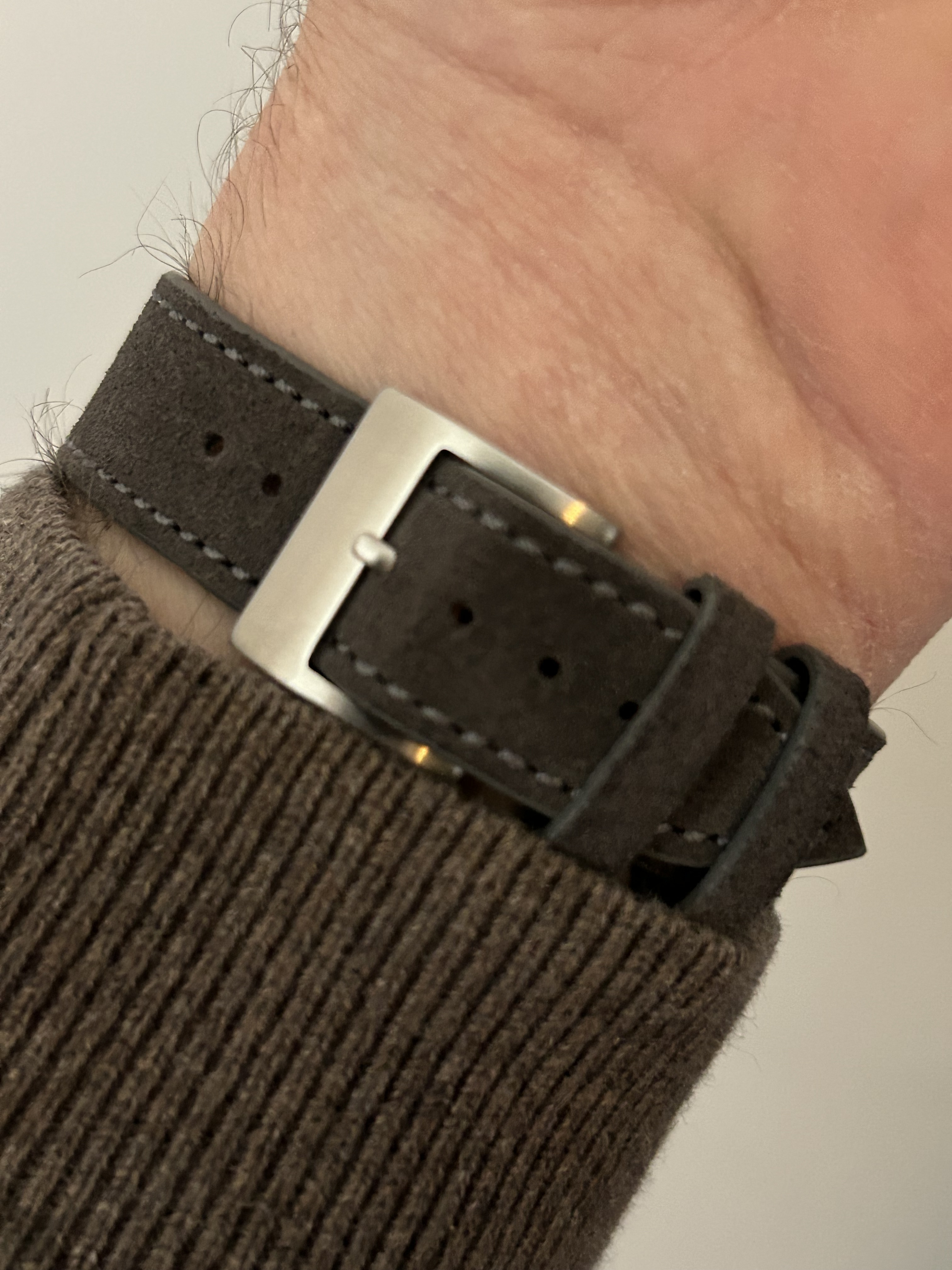 Dit horloge zou heel goed een Molequin kunnen hebben; de band die er nu op zit oogt gewoon te dik. Wat je kiest maakt haast niet uit. Een Cordovan zou ook heel goed kunnen. Er zit er eentje om de '20 Speedy 1861 die ik nu draag. In die ene specifieke Bordeaux-achtige kleur. Je GS is meer een dress-watch dus pas sowieso op voor contrasterende stiksels. Overweeg ook een korte versie, gezien je polsmaat! Ik koop alleen maar de “Short” versies. Zelf een 17 cm pols. Dan zie je ook die flap niet meer op je eerstvolgende foto. ![]()
