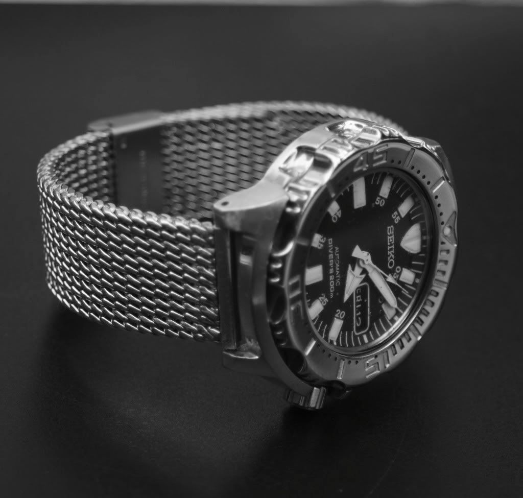 Sorry, maar deze combi vind ik minder geslaagd. Een meshband zou ik zelf met een dresswatch combineren. En wat je ook van een Monster vindt; het wordt nooit een dresswatch. En het verwijderen van de verf van de bezel zou ik netter doen. Nu lijkt het een beetje op grote stappen, snel thuis…