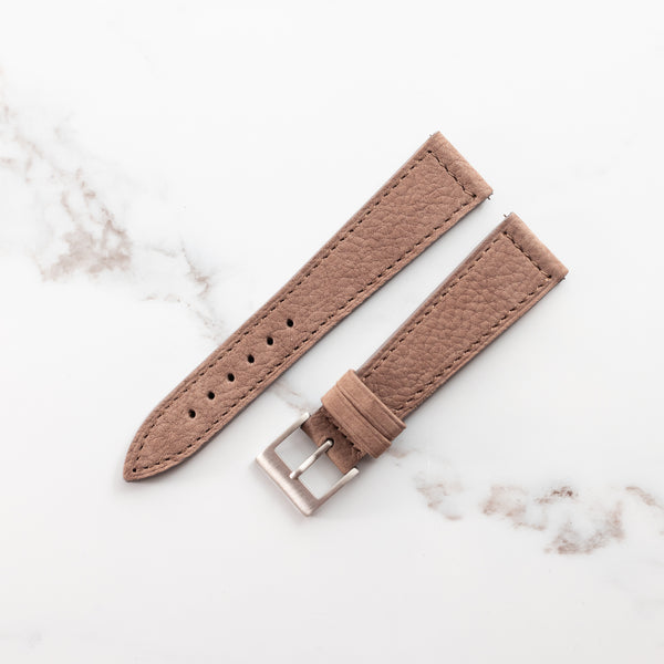 Dit bandje is gemaakt van het beste deel van de stierenvacht en is fijn opgeschuurd aan de korrelzijde. Dit geeft het leer die kenmerkende, fluweelzachte “velvet” look en feel. De kleur Taupe is de perfecte tussenkleur (grijs/bruin) die werkelijk op elk horloge past, van vintage dress watches tot moderne sportmodellen.