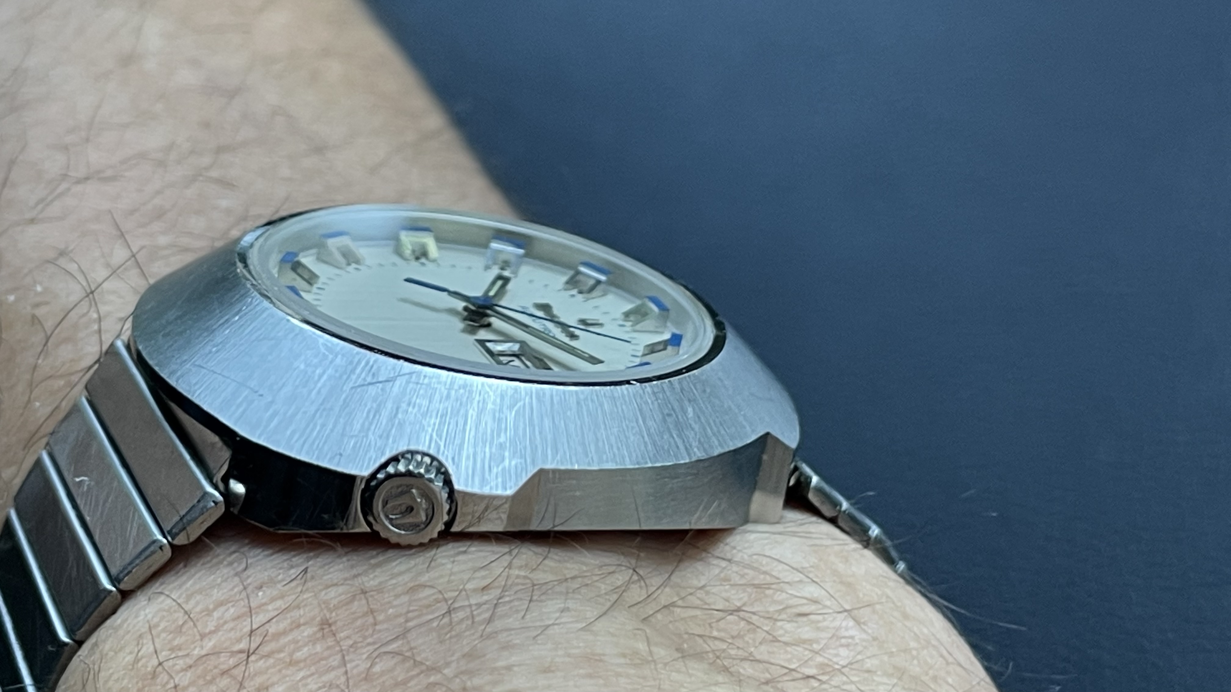 De wijzerplaat is geborsteld met een kleur die zich het beste laat definiëren als vintage champagne. Die wordt doorbroken door opgelegde chromen logo’s en indices met een bijzonder goed geslaagde combinatie van blauwe wijzers en markers.