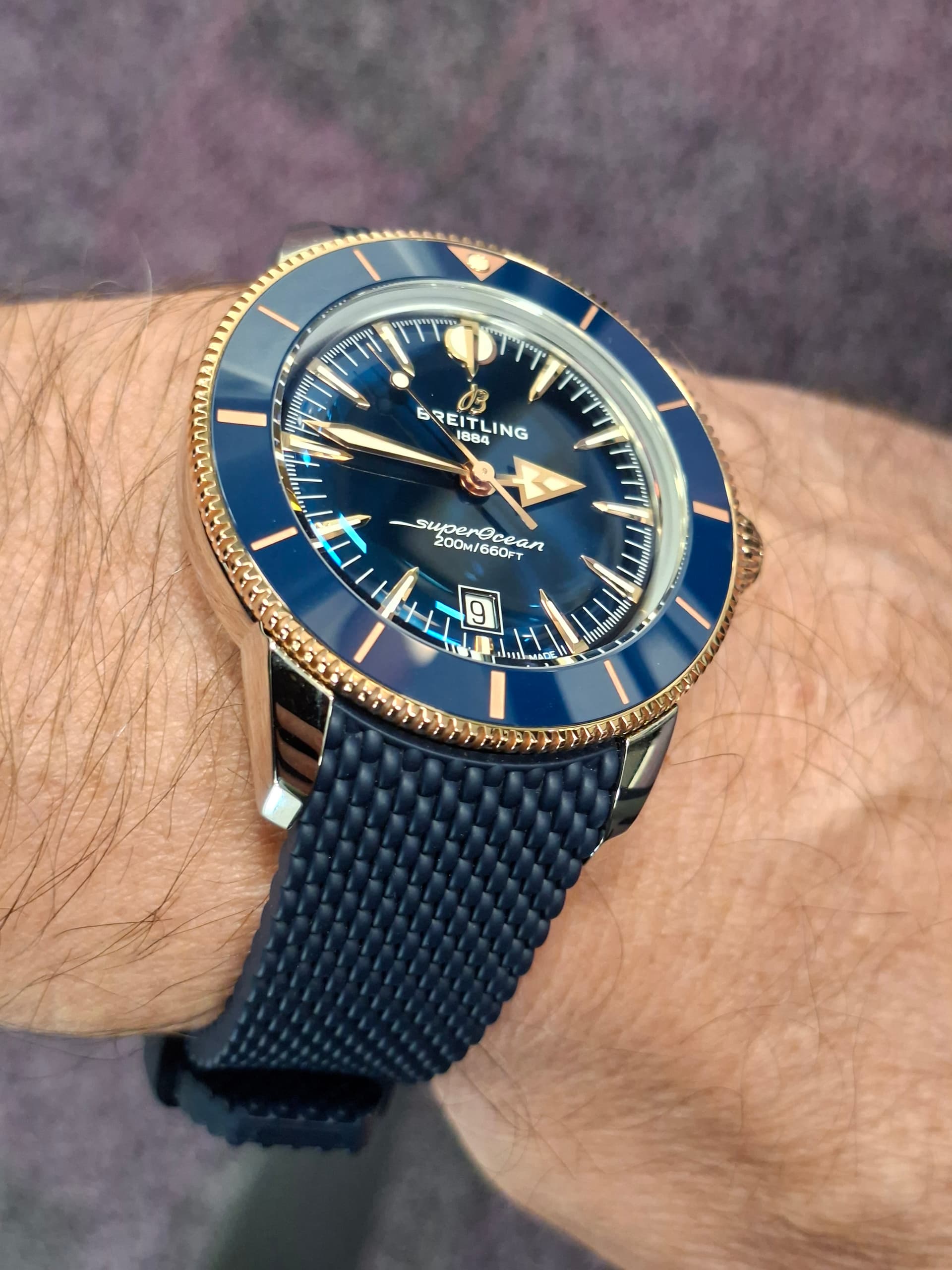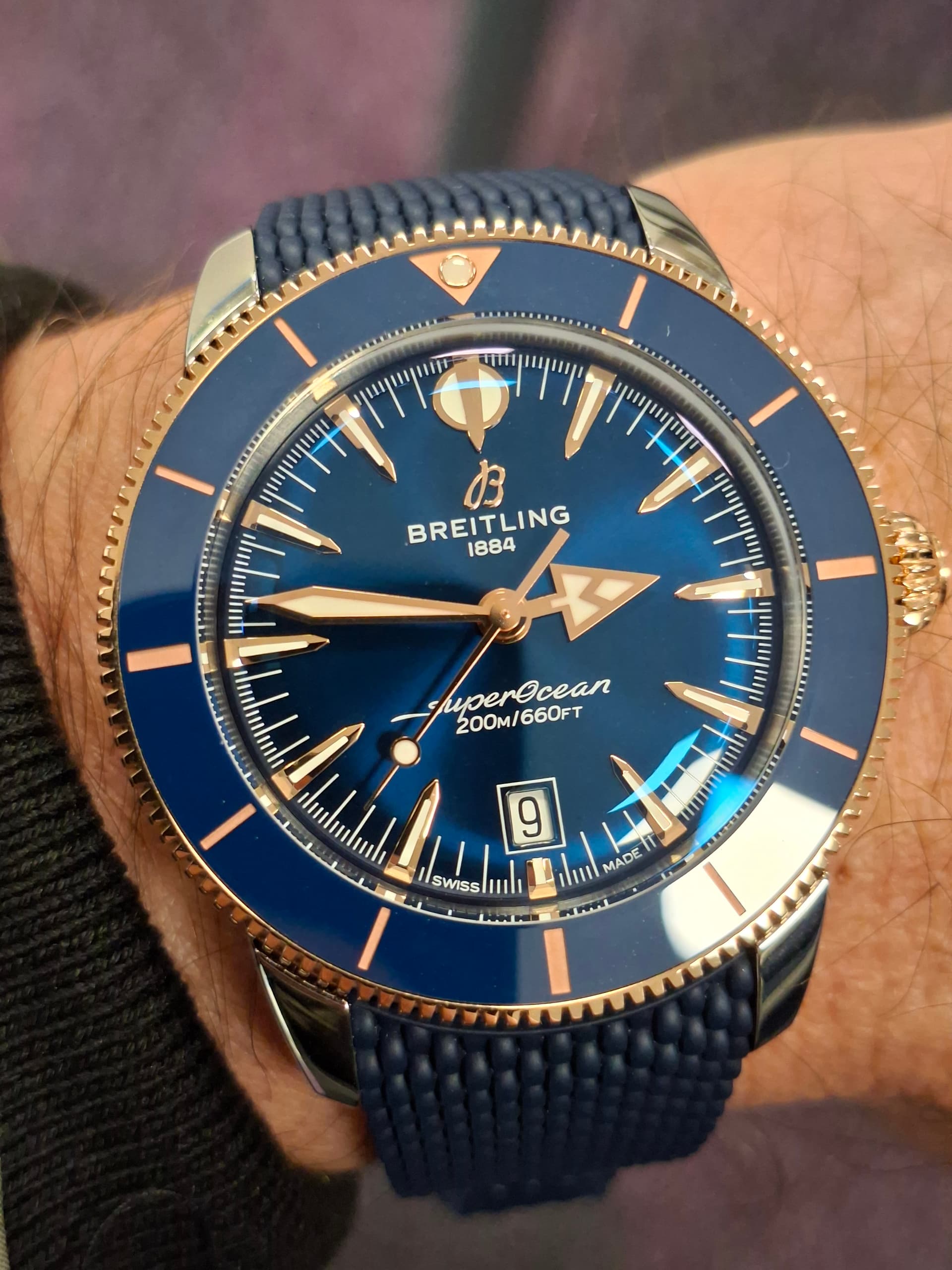 Onlangs een nieuw horloge aangeschaft, een breitling superocean heritage. Ik was hier naar op zoek maar door de verschillen tussen de modellen kon ik niet kiezen. Het oudere model gepast met het b20 uurwerk. Modellen gezien en gepast maar dan was het net niet de klik. Deze uitvoering had net iets extra’s nuances en dit gaf voor mij de doorslag. Deze zou het worden. Tegen alle verwachtingen in vond ik dit grotere model beter passen op mijn pols dan de kleinere modellen. Waarschijnlijk door de luglengte, vorm.