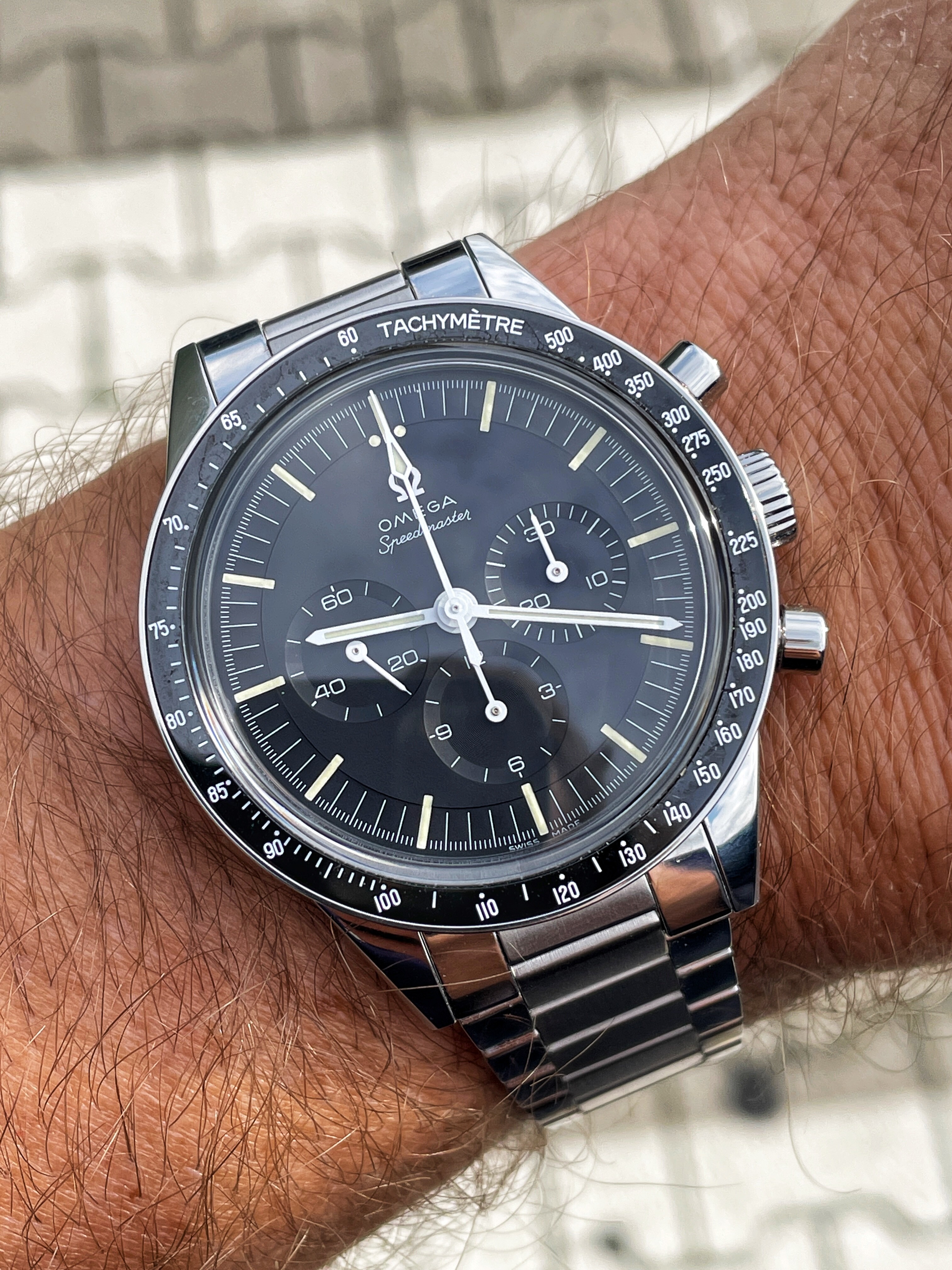 Het blijft mijns inziens de perfecte “daily” Speedmaster. Met de keramische lunette, het prachtige saffierglas (zonder milky ring) en de strakke afwerking, is het geschikt om elke dag te dragen zonder je zorgen te hoeven maken. Niemand op straat zal het herkennen, het is dus echte “stealth wealth”. Als je het naast de 3861 Moonwatch houdt, is het geen wereld van verschil, maar zijn wel alle puntjes op de “i” gezet. Het uurwerk steekt er met kop en schouders bovenuit en is echt prachtig om te zien.