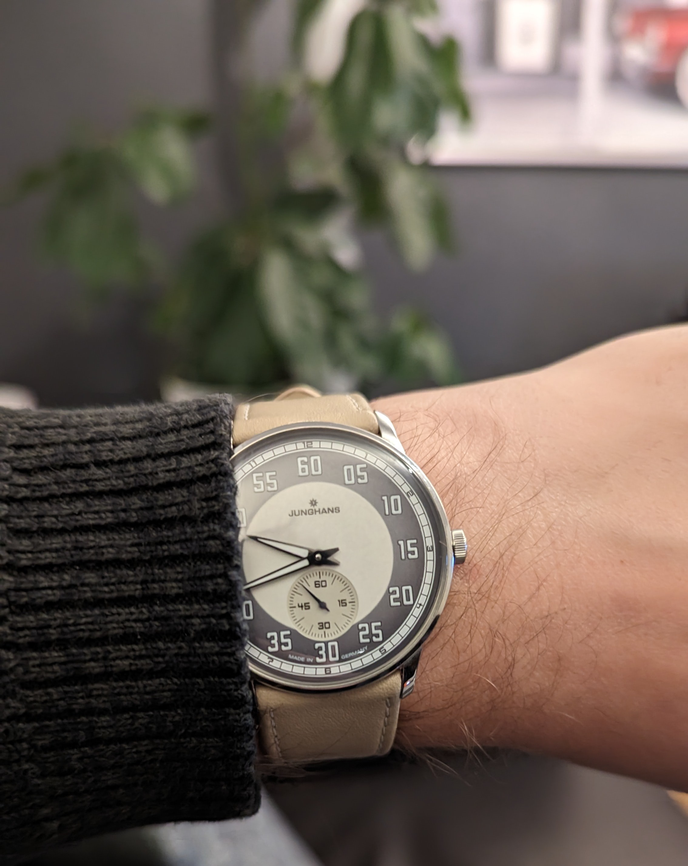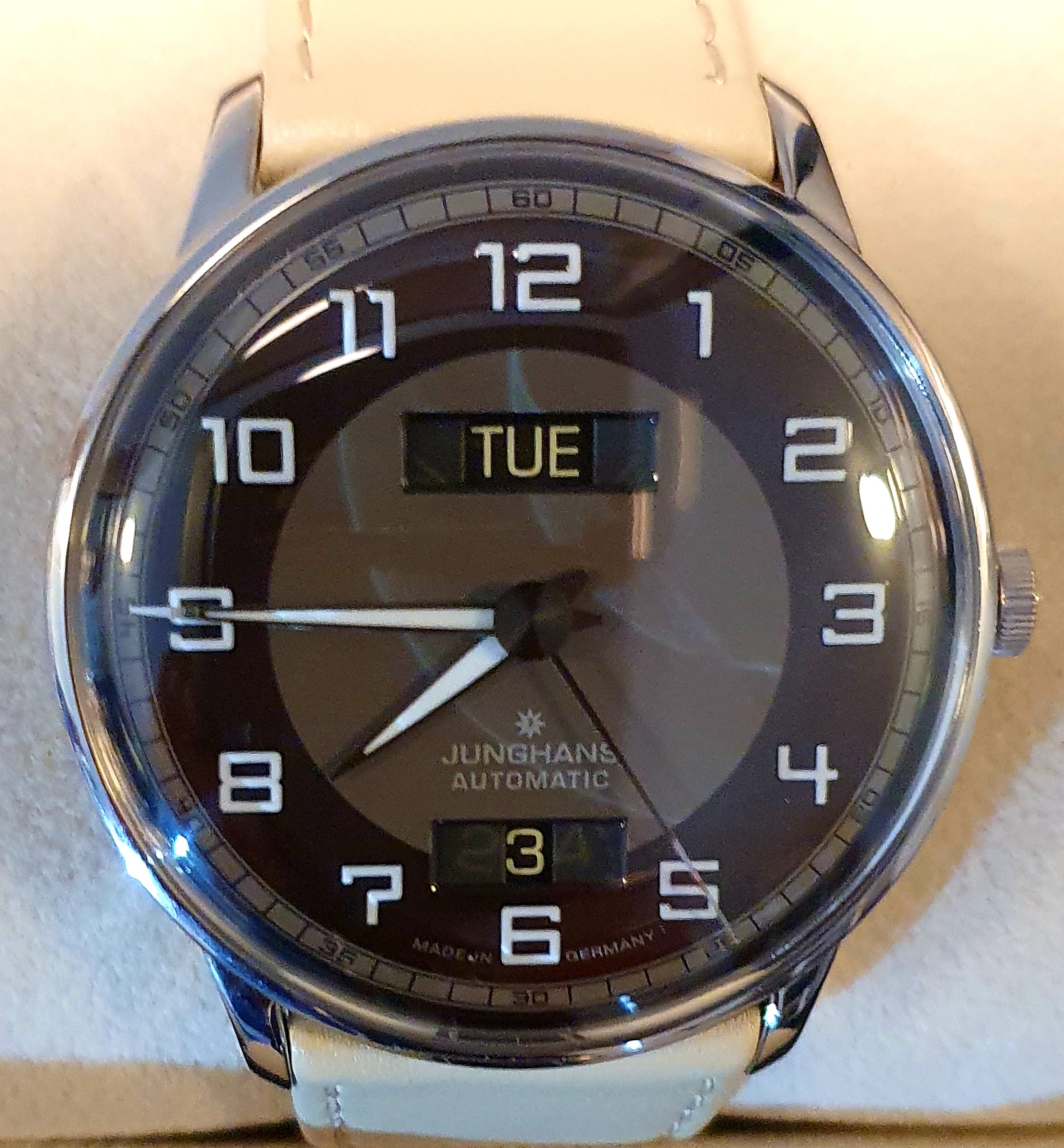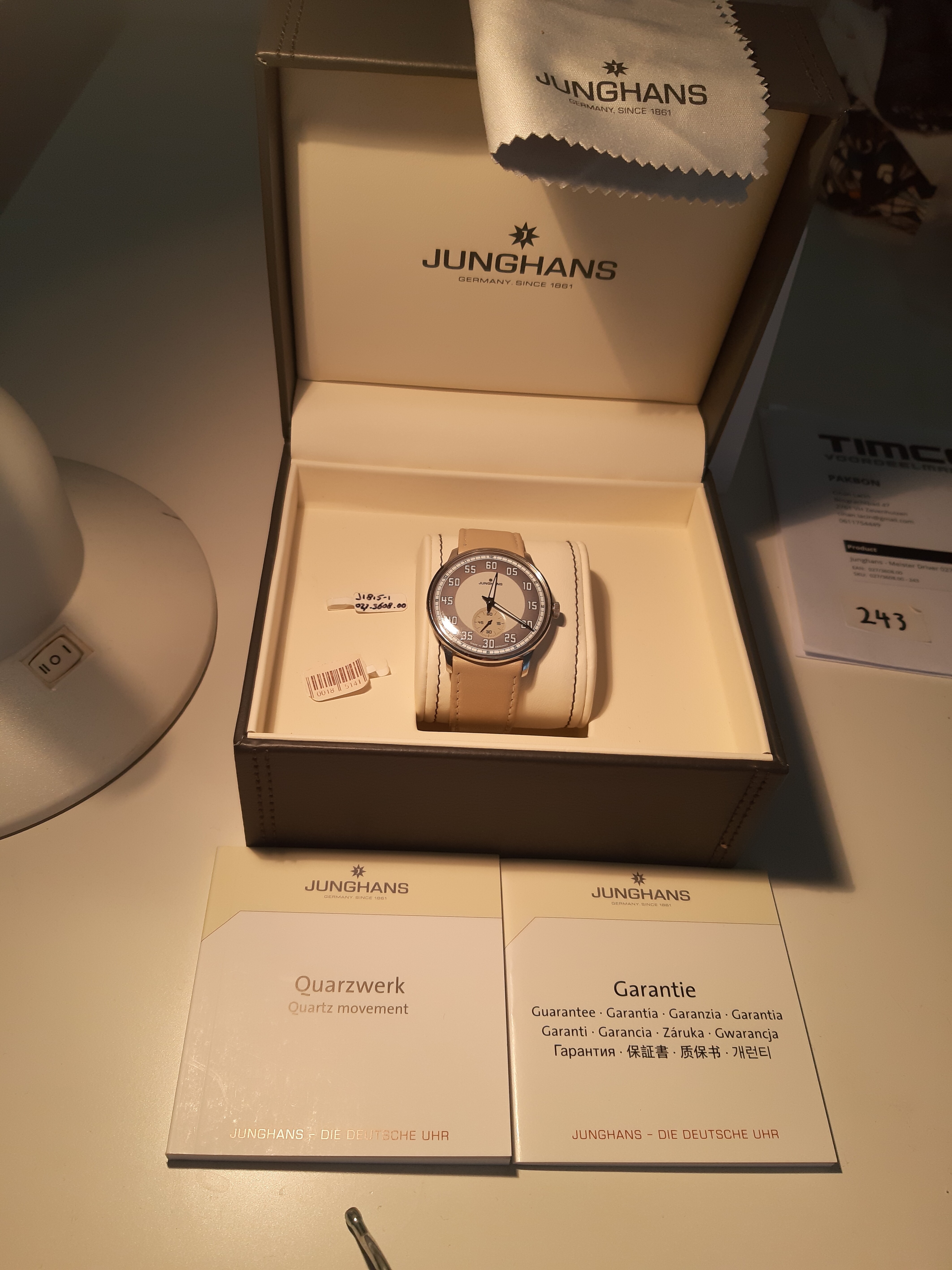 Dit horloge heeft een beetje een geschiedenis hier op het forum. Eind vorig jaar was er bij een opkoper een grote uitverkoop met kortingen tot 50 procent. Dit horloge werd gekocht door iemand en weer teruggestuurd omdat het plexi er niet uitzag. Het kwam weer online te koop, nu met 70 procent korting en de melding dat het glaasje niet ok was. Ik wilde het kopen maar was te laat. Het horloge kwam ik hier op hf weer tegen, @Cihanski had het gekocht. Nu kende ik cihan een beetje van een andere deal een paar weken ervoor en schreef hem dat hij mijn gegevens nog had mocht de Junghans niet bevallen. Zo geschiedde, het was niet zijn ding en ik mocht het overnemen tegen de prijs die hij er voor betaald had. Paar dagen later en het horloge kwam bij mij binnen. Alles zat erbij poetsdoekje inclusief, behalve… de doos. Ik googelde even welke doos erbij hoorde en jawel hoor het was 1 vd 2 Junghans dozen die @Meistersinger te koop had staan dus Jasper een bericht gestuurd en nu had ik de set kompleet. Nu, het horloge…Perfecte staat maar plexi een drama…Mijn plaatselijke juwelier verving het plexi voor de prijs van omgerekend 15 liter benzine, dus dat viel super mee.