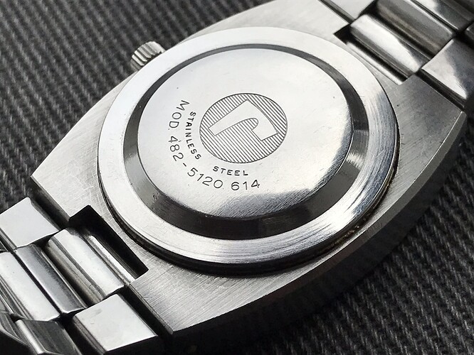 , de bezel licht gepolijst en alles weer in de kast geplaatst. Kijk nou, dat is toch een mooi stukje geschiedenis, onvervalst seventies design ( kijk dat logo op de backplate, die torenhoge indices en hoe de kast in de band doorloopt…)