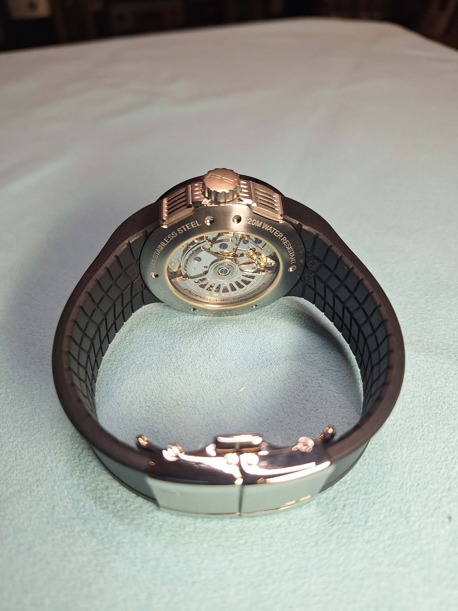 Anyway de Porsche Design Flat Six P6340 uitvoeringen met een rubberen bracelet zijn al op leeftijd en harden dan uit waardoor ze gaan scheuren en de band die op de vlindersluiting word geplaats moet op maat worden gemaakt van de drager, heb je een kleine pols dan is later de verkoopbaarheid wel gelimiteerd.