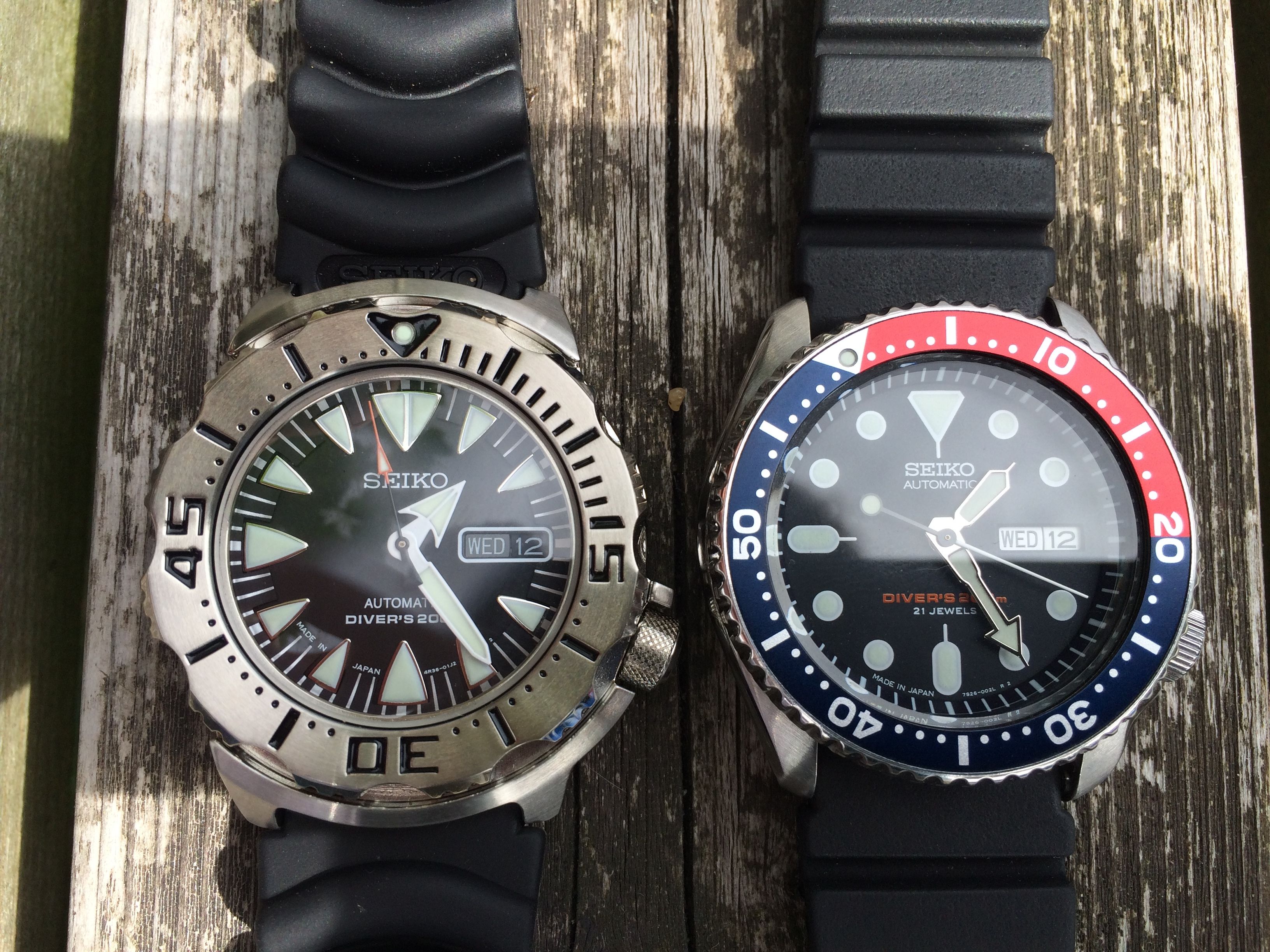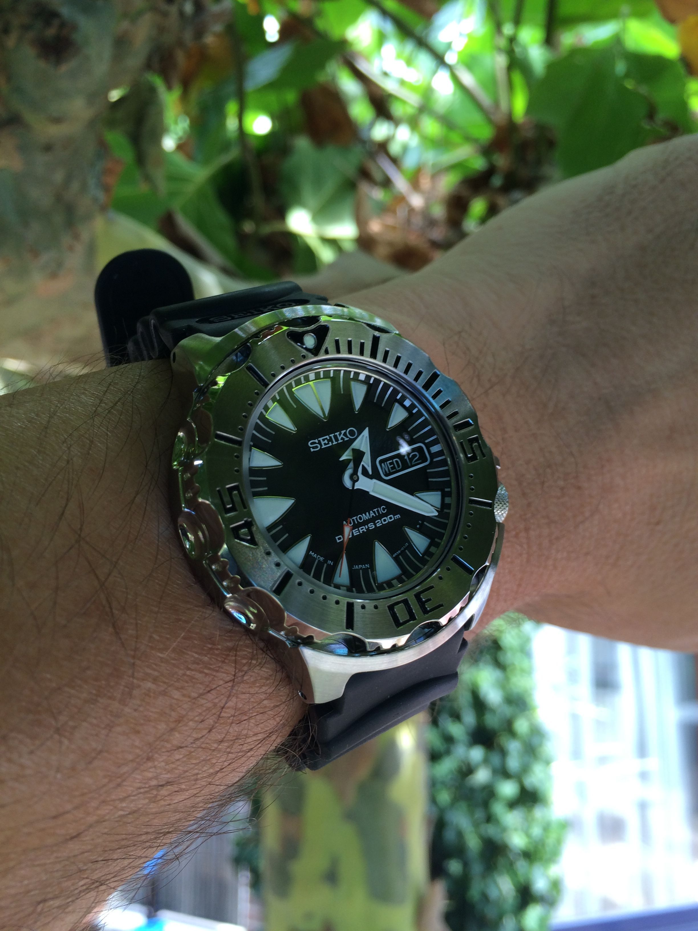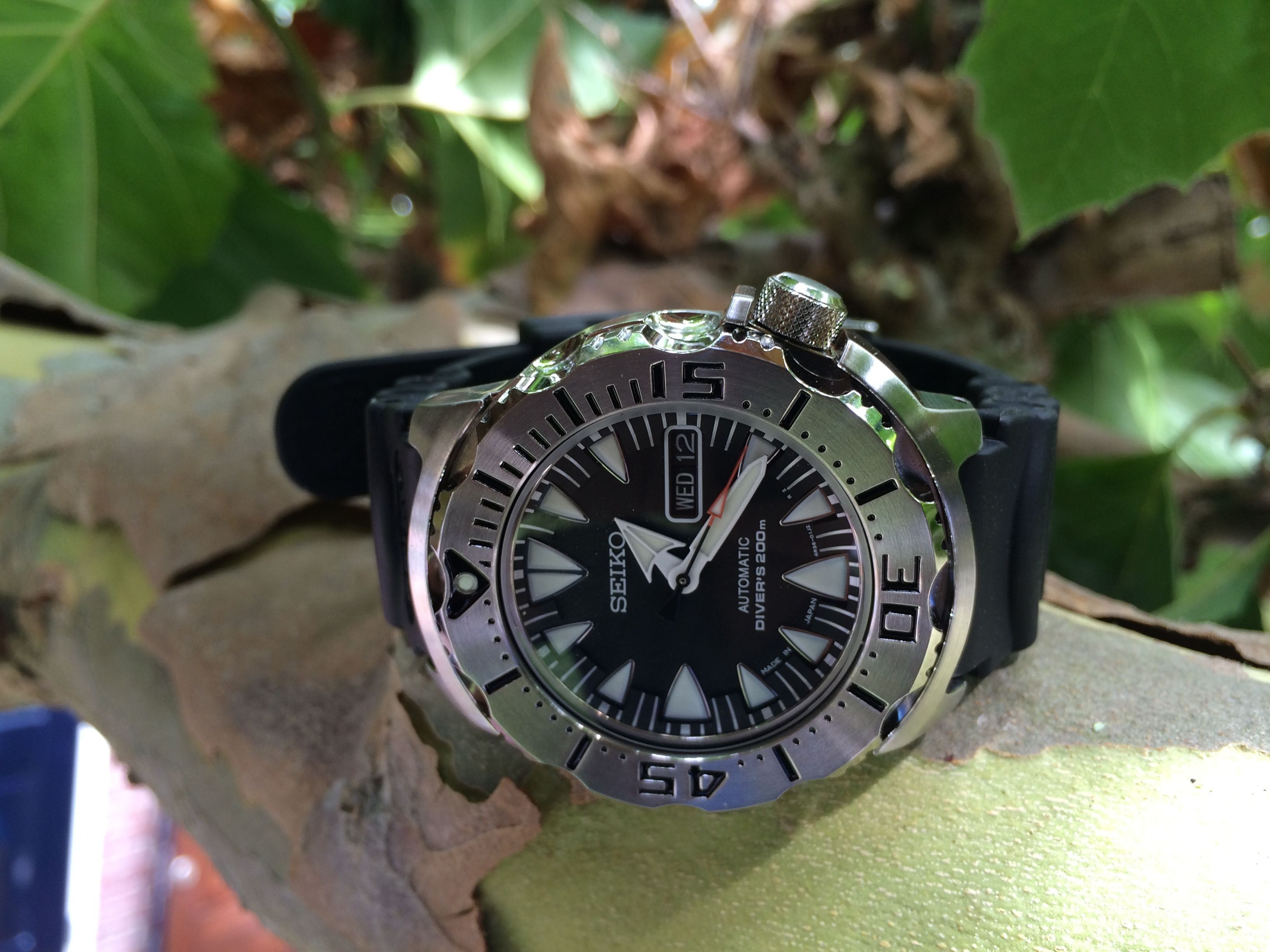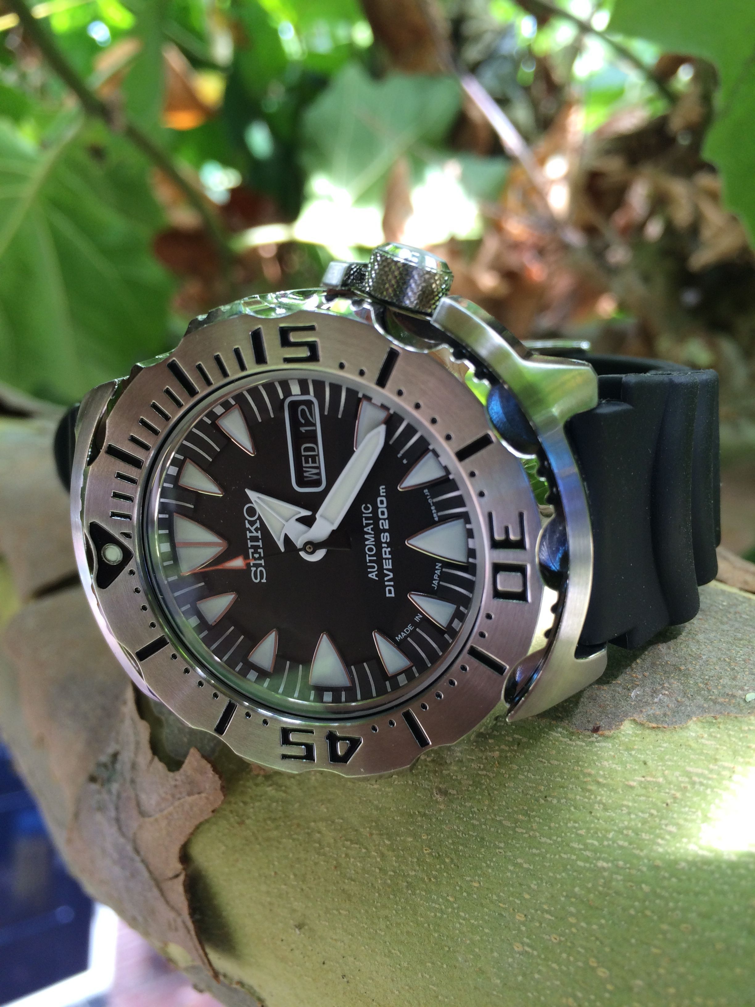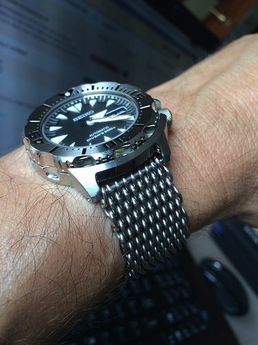 Mijn twijfels vooraf bleken zeer ongegrond. Daar waar ik de SKX009 nogal klein vind dragen was ik bang dat het Monster dat ook zou doen. De specs zijn immers bijna gelijk … zou je denken. Maar niets is minder waar. Wat een fantastische klok is dat Monster en hij draagt echt aanzienlijk groter dan de SKX. De bezel is een tikkeltje groter (1,5mm), maar de shrouds aan de boven en onderzijde zorgen ervoor dat de totale hoogte tegen de 45mm aantikt. En dat maakt 'm optisch echt wel groter. I love it, I’m a Happy Camper! Geweldig design met de combinatie van gepolijst en geborsteld staal, en de rood/oranje second hand is net opvallend genoeg om een contrast te vormen.