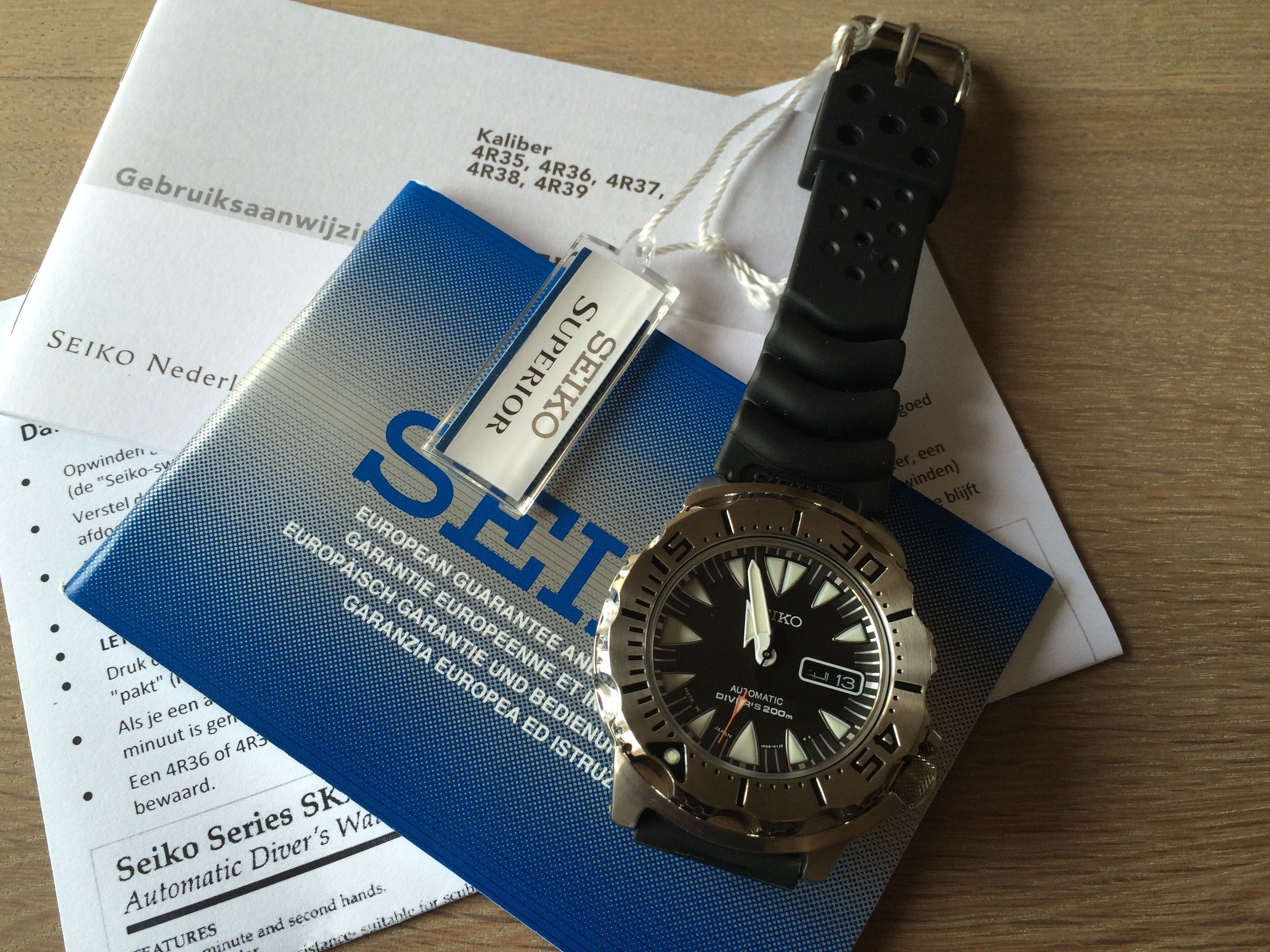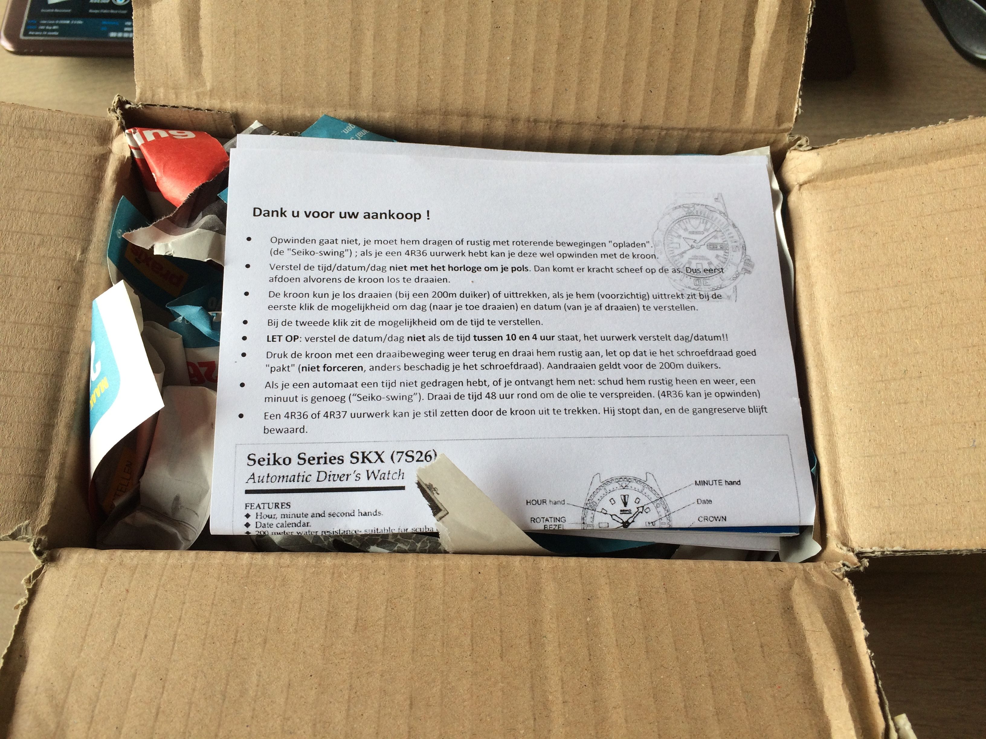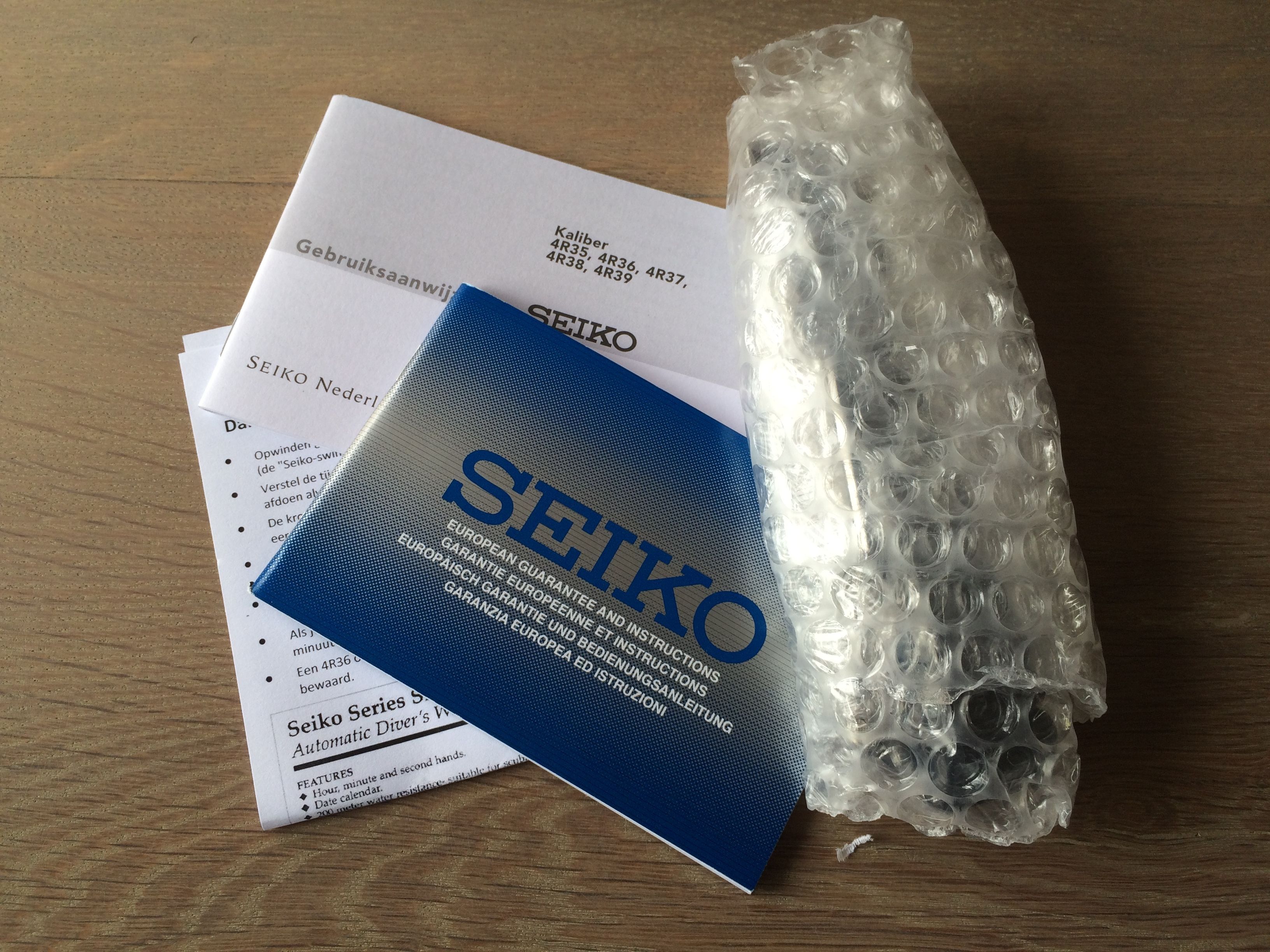 Na het deskundige gebruikerspanel van dit forum geraadpleegd te hebben heb ik besloten het zwarte monster op rubber te bestellen: De SRP307J1. Zoals we gewend zijn verliep de bestelling bij Rob zeer soepeltjes en vandaag kwam er een PostNL busje voorrijden met … jawel, de nieuwe klok.