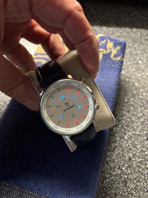 hier ook 1 van Detomaso, de verkoper dacht dat hij kapot was vw geen wijzers en vroeg 2 €, was helemaal nieuw en met leren bandje erbij, gewoon gekocht. Je moet knopje aan zijkant even indrukken , dan gaan de lichtjes draaien en stop dan op de tijd, heel leuk