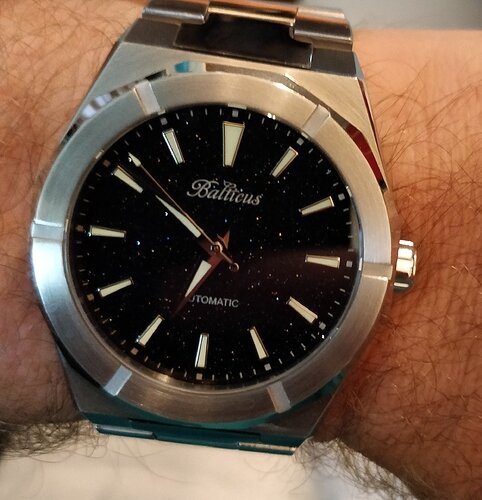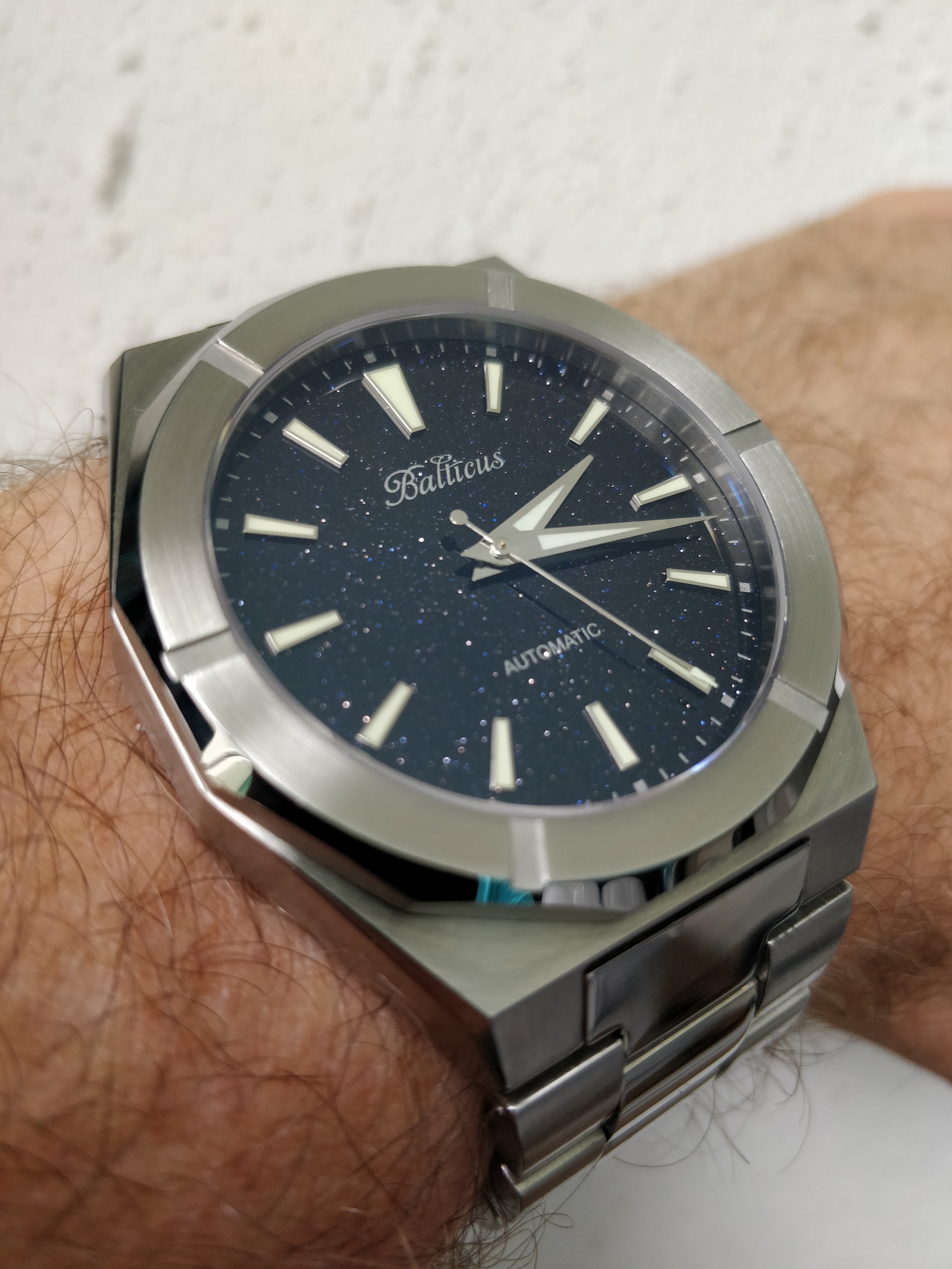 Net toen ik had besloten dat 38-39mm voor mij de optimale maat was, kwam ik deze tegen. De Balticus Stardust met die o zo fraaie wijzerplaat. Snipverdehip. Die vond ik altijd al zo prachtig. helemaal na de review door @GiveMeYourDoughhier. Met z’n 42mm echt wel groter dan dat ik zojuist weloverwogen voor mezelf had vastgesteld.