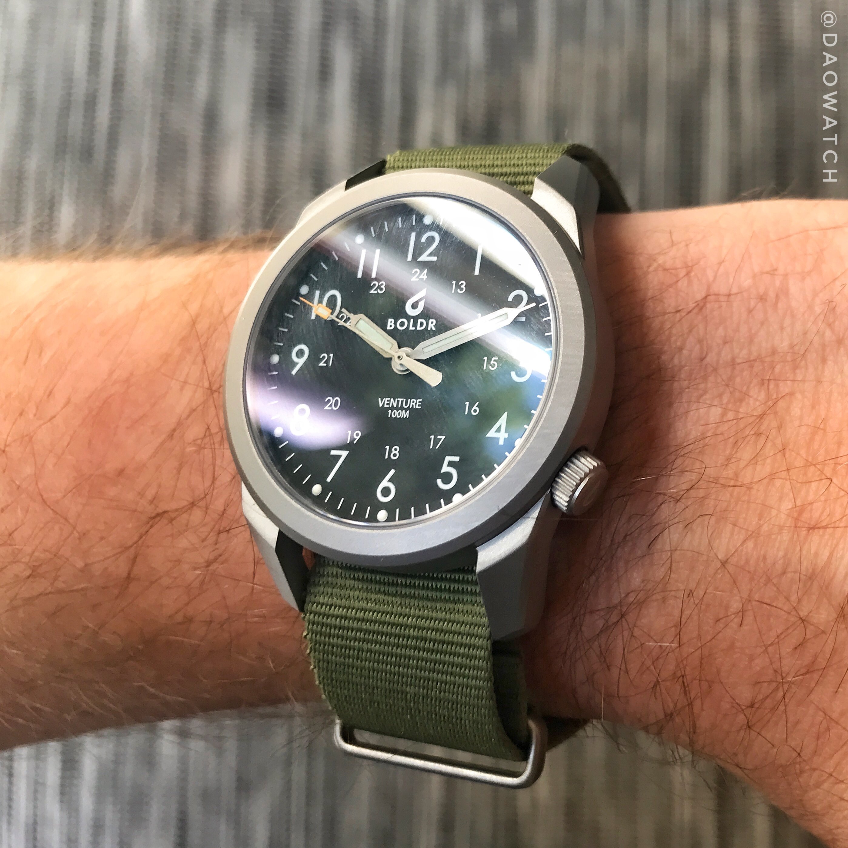Ze hebben twee voordelen en een nadeel: elke nato zal erop passen en die loopt er strak onderdoor. Zo laag zitten de spring bars dus. En dat zie je, de nato maakt een mooie hoek en wordt niet onder de kast gedrukt. En door de lugs bolt het horloge mooi over mijn pols.