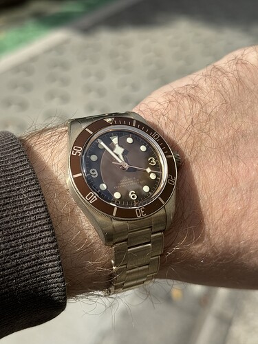 Ik heb geen idee hoe het aan de binnenkant is, heb deze (nog) niet open gemaakt. Maar ik kan me voorstellen dat in een luchtdichte omgeving de patina niet zo snel zal vormen en mocht dat wel gebeuren doet het denk ik niet zoveel met andere dingen erom heen. Ik weet dat de caseback staal of aluminium is met een coating zodat je pols niet constant op het brons zit, kan best zijn dat zo ook iets aan de binnenkant hebben gedaan
