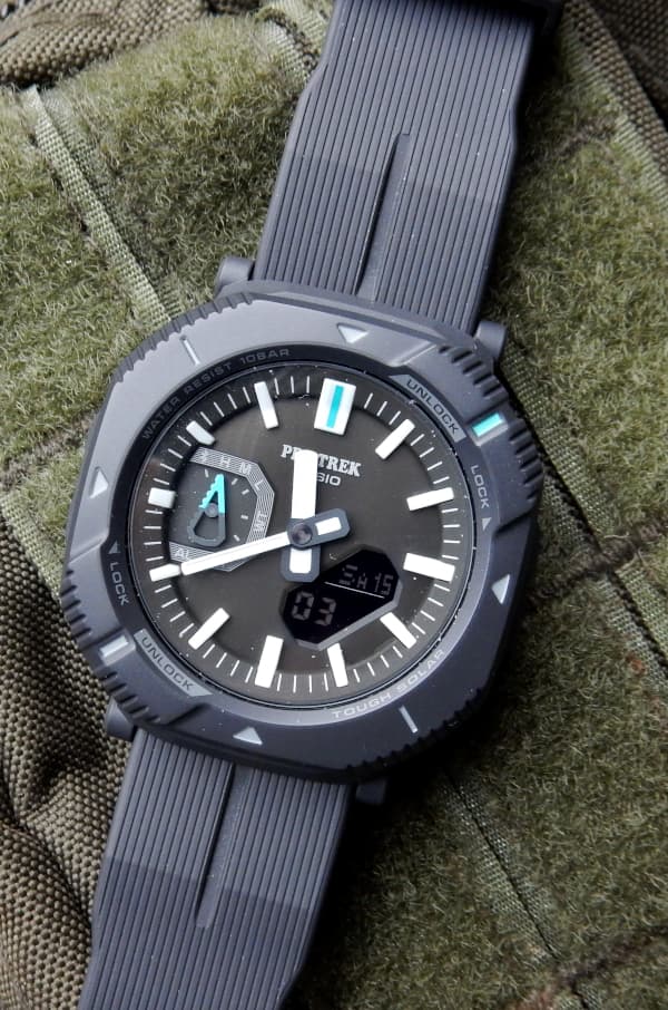 Zeker! Er zijn 4 of 5 verschillende versies. Desert, Grey-white, Drab-brown … Ook kunnen ze geleverd worden met een bungee strap, onder andere om het horloge over de mouw te kunnen dragen. Durfde ik niet aan en is ook niet nodig. Is pas sinds een jaar in productie. Je zou het een Protrek-light kunnen noemen. Ik heb hem hier op HF nog niet gezien, zijn er hier meer PRJ’s? ![]()