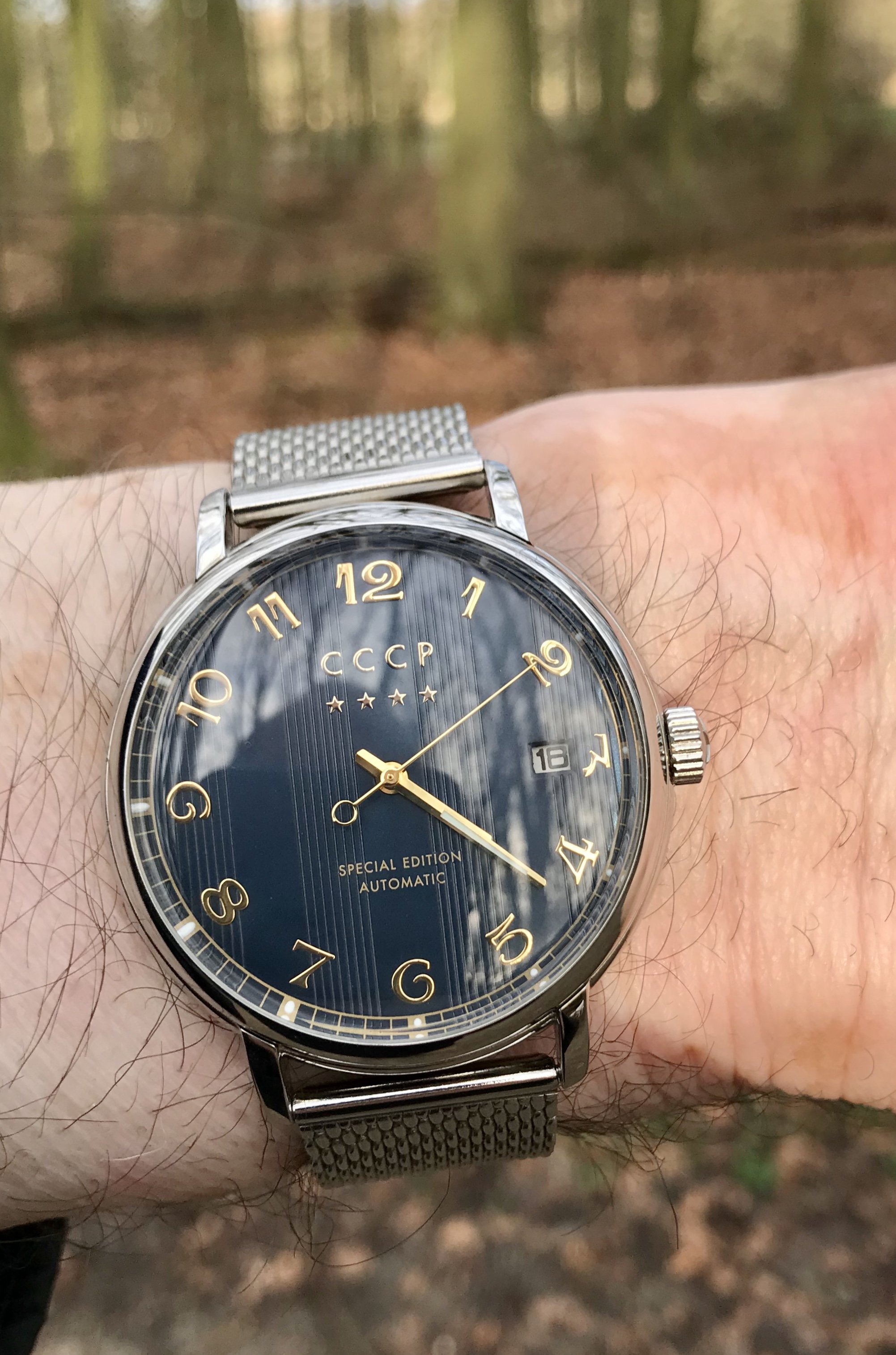 Een CCCP special edition, design voor CCCP van Alexander Shorokhoff, de Duitse horloge ontwerper. Zijn stijl is ook erg herkenbaar! Prachtige blauwe reliëf-wijzerplaat met goudkleurige opgelegde cijfers. Strak gepolijste kast met een zichtbodem met rood glaasje, Russischer wordt t niet Onder motorkap ook een echte Rus, de Slava 2427. Standaard geleverd op mesh met inscriptie op de sluiting. Overall afwerking geweldig, toppertje!