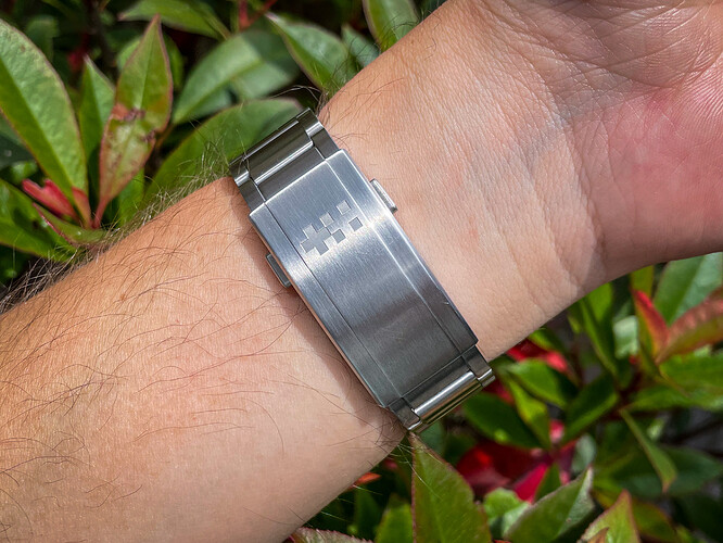 De bracelet lijkt gewoon een soort oysterstijl, maar dan met een bredere centerlink. Mooi, maar iets anders is nog belangrijker. Het is bijna misdadig dat andere bracelets niet deze features hebben: quick release en verstelling in clasp. Twee palletjes inknijpen en de endlink is los (zie foto met caseback, bij de specs). En ook de snelverstelling in de clasp werkt perfect en makkelijk. Warm weer, koud weer, maakt niet uit. Binnen twee seconden zit die weer perfect.