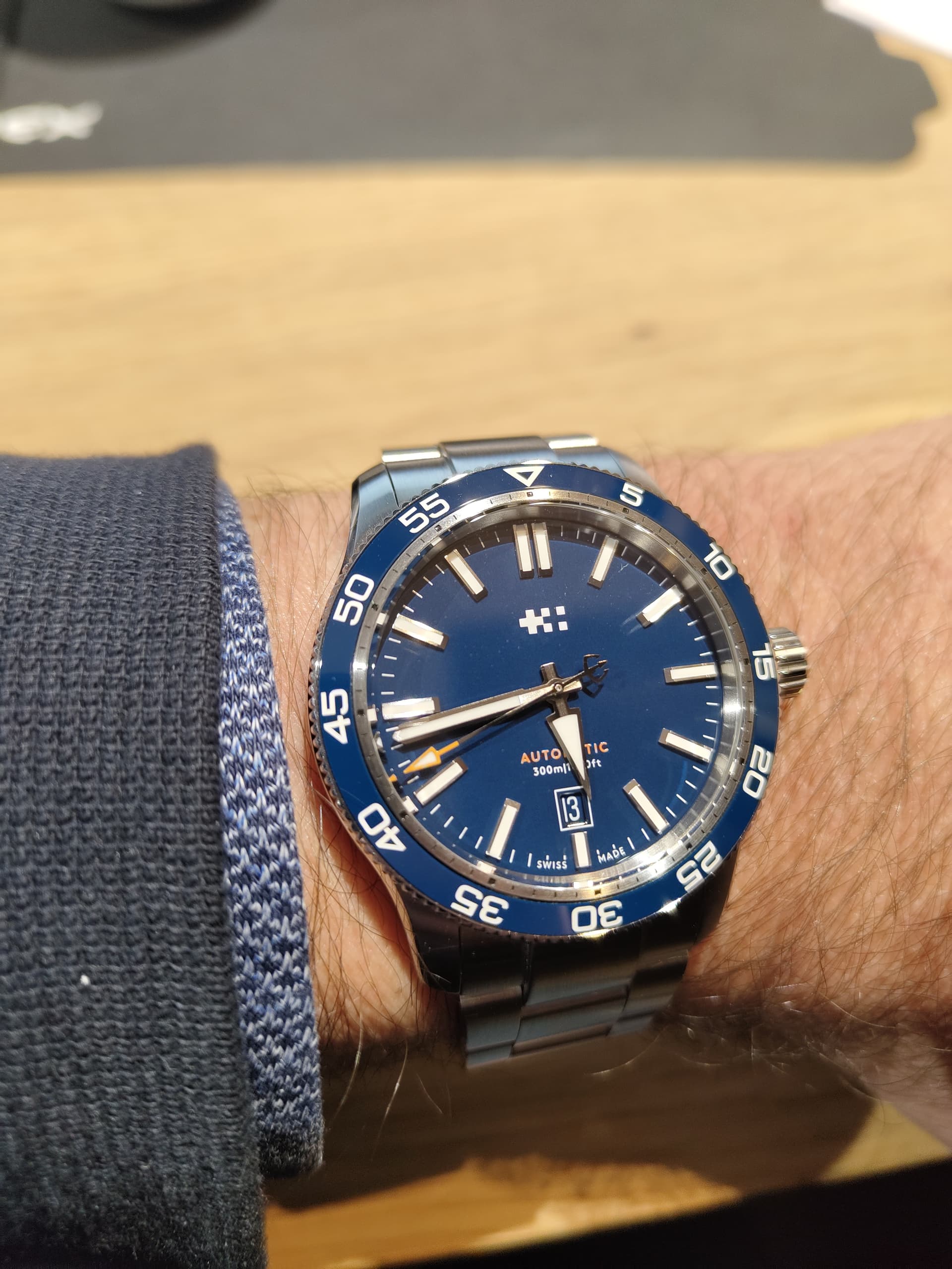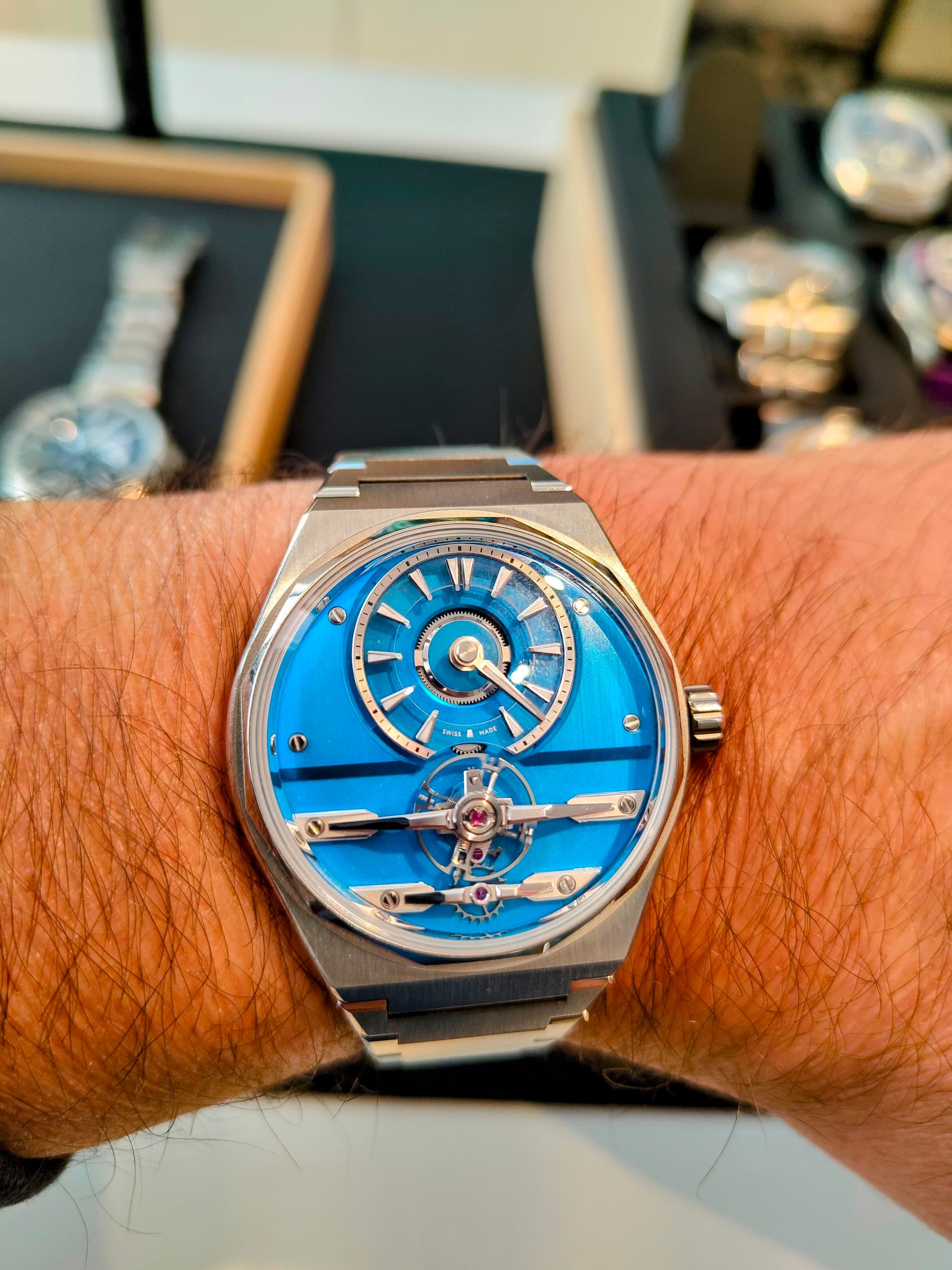 Mijn mond viel letterlijk open, wat was me dat! En niet alleen bij mij, ook mijn vrouw zei onmiddellijk die nemen we mee! Aanvankelijk wou ik er nog eens over nadenken want mijn laatste aankoop was nog maar in augustus toen ik een Seamaster (ook) in Londen kocht. Maar die Loco bleef maar aan mijn pols kleven terwijl ik hem in alle richtingen ronddraaide om het schouwspel van die prachtige blauwe dial te bewonderen die er werkelijk vanaf spat. Die prachtige bruggen met de beweging… Ik moet zeggen dat het niet lang geduurd heeft vooraleer ik besefte dat dit hét horloge is voor mij. Totaal onverwachts. Nochtans al veel naar de Loco gekeken online maar in het echt is hij onweerstaanbaar. De kogel was dus door de kerk en de Loco deed ik dan ook meteen om de pols terwijl de Speedmaster onherroepelijk in de pouch verdween die ik er gratis bij kreeg om vervolgens zo fier als een pauw door Londen te flaneren