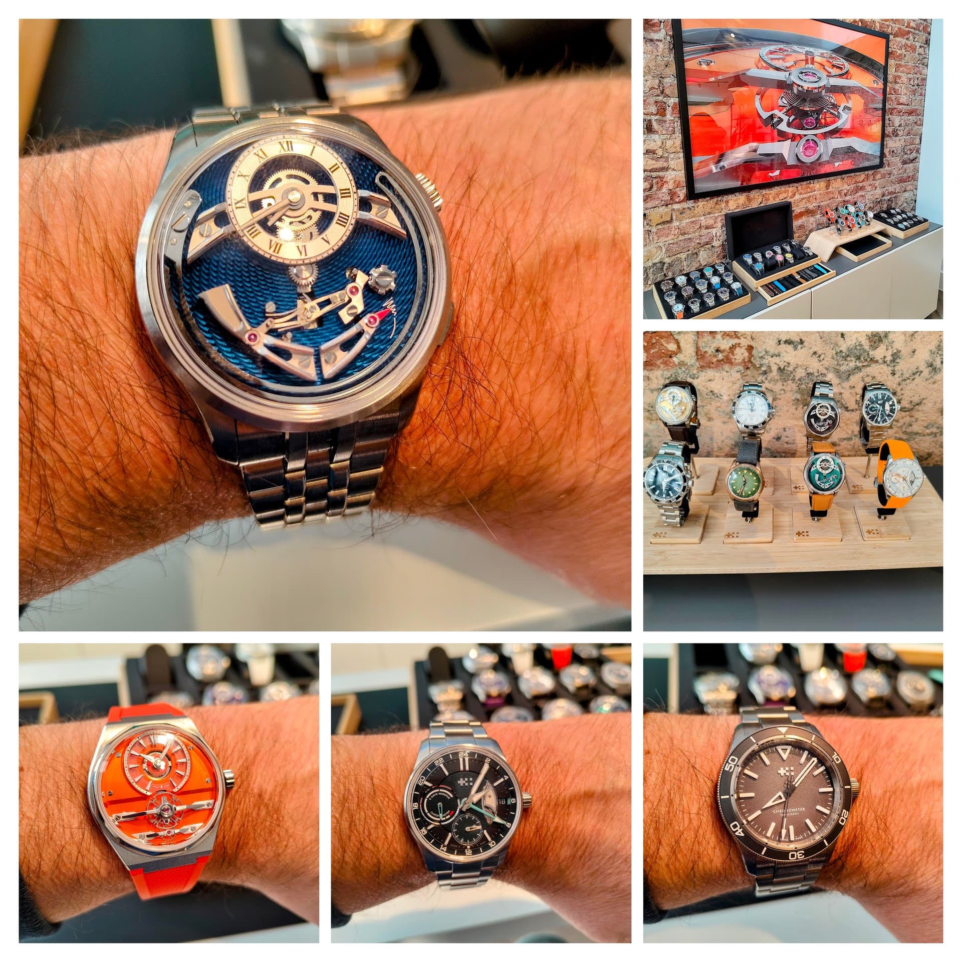 Ik had al een tijdje mijn oog op de C60 Lumière maar ja, ook een C60, die heb ik al. Dan maar de nieuwe C63 True GMT met een fractie doorkijk op het binnenwerk, mja, mooi maar een GMT spreekt mij niet onmiddellijk aan en het ontwerp is voor mij een twijfelgeval. Dan de Bel Canto, een blauw pareltje. Goed dat ik die eens kon passen, niet meer dan dat. Daarna de Loco in het oranje. Wat een prachtig ontwerp, Dat balanswiel dat je ziet draaien maakt het superleuk maar oranje is dan weer té opzichtig voor mij. Op dat moment was ik nog helemaal niet van plan om een horloge te kopen, dat was niet de bedoeling van mijn bezoek. Horloge binnendragen, genieten om de CW’s in het echt te mogen bewonderen en hup terug op weg om Londen te bezichtigen, dat was het plan. Een heel strak plan.