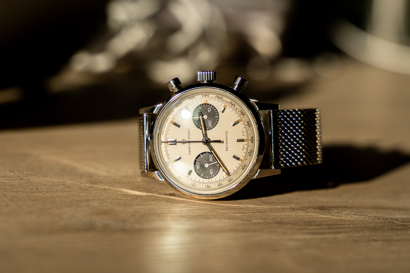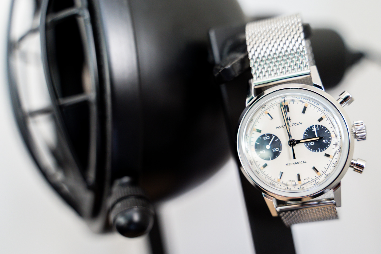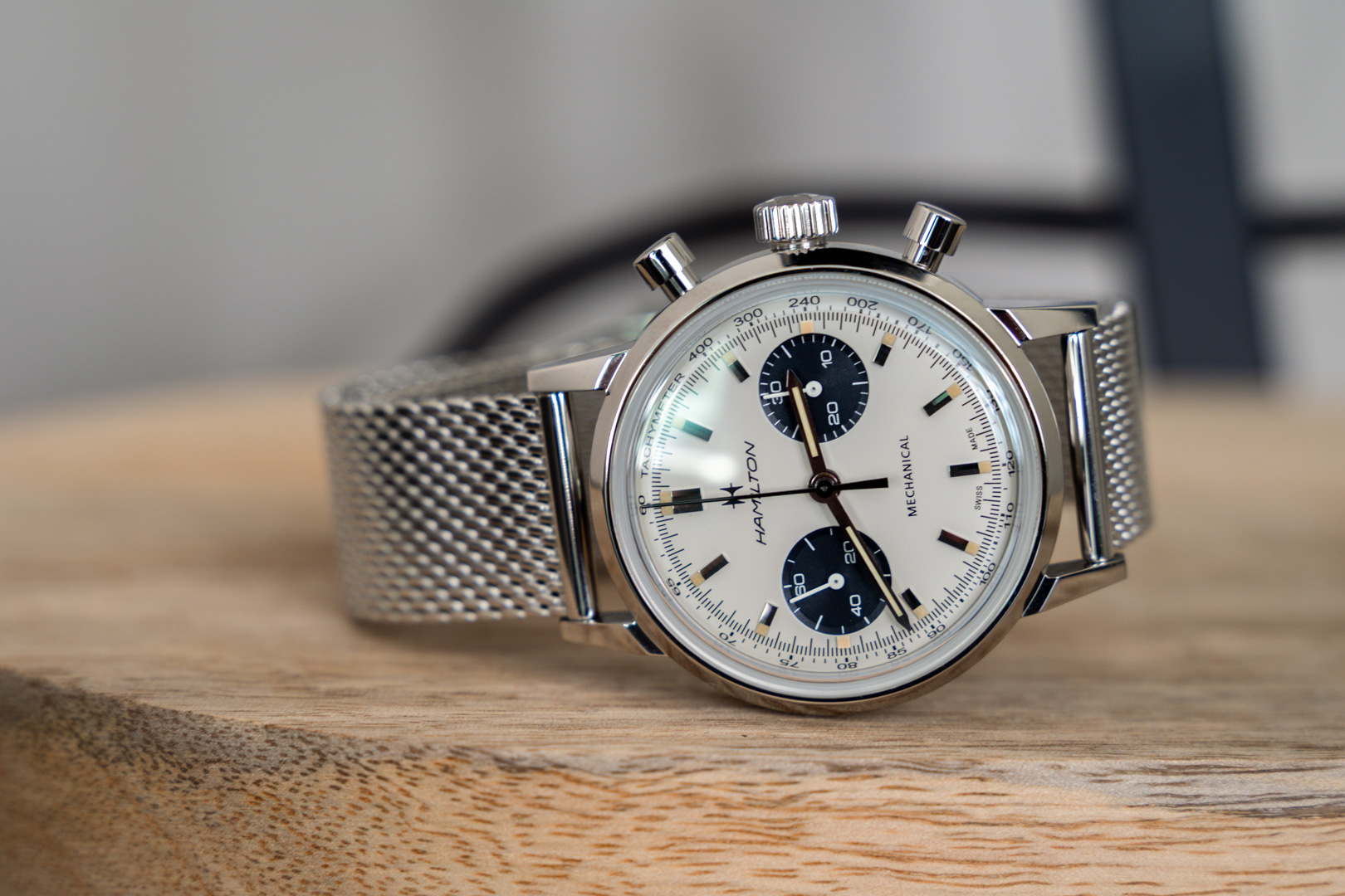 De Hamilton Intra-matic Chrono Panda H variant handwinder kom mij vanaf de plaatjes altijd wel bekoren. Ik hikte alleen een beetje tegen de casedikte van 14.3mm aan. De plaatjes van @Gerard55 en een goede aanbieding trokken mij uiteindelijk over de streep. De dial kleurt in de zon richting creme maar verder zitten er meer witte tonen in de plaat.