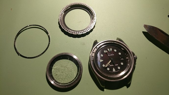 Ik had nog nooit een monocoque open gehad, dus het was een beetje een uitdaging. Allereerst de bezel eraf. Dat is bij een Citizen duiker niet eenvoudig, weet ik uit ervaring. En dat was bij deze niet anders.