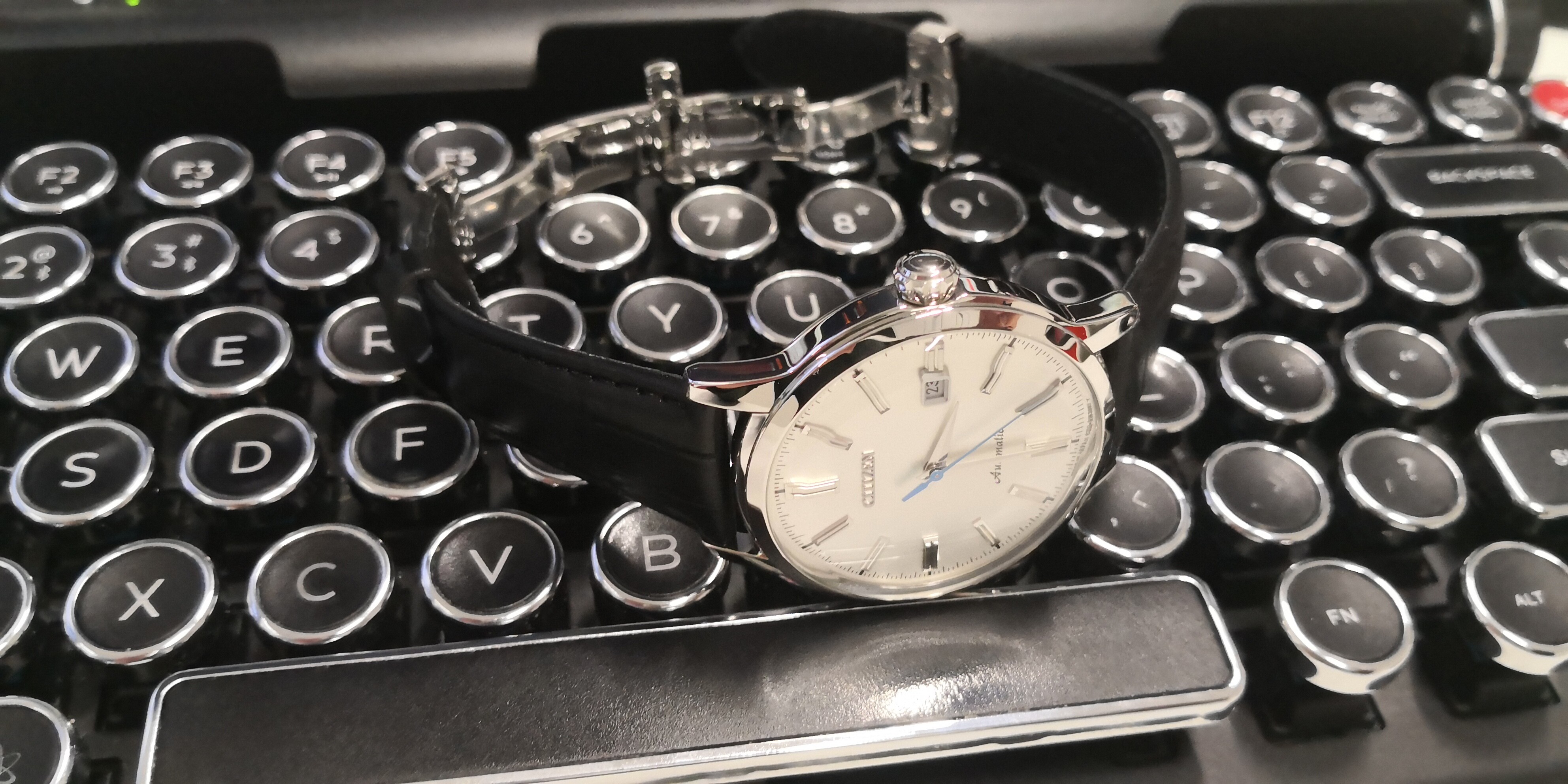 Mijn oog viel dus op de NK0000-10A. De zilveren kleur van de wijzerplaat en de blauwe secondenwijzer trokken mijn aandacht. Het Citizen 8310 uurwerk kende ik niet; daar is bijna niks verder over te vinden. In ieder geval triggerde een gangreserve van 60 uur mijn interesse.