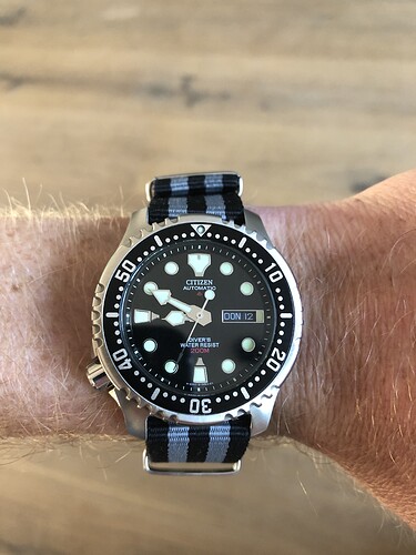 Heerlijk horloge, inktzwarte dial, alles mooi uitgelijnd en op een bond nato draagt ie in de zomer heel fijn:-)