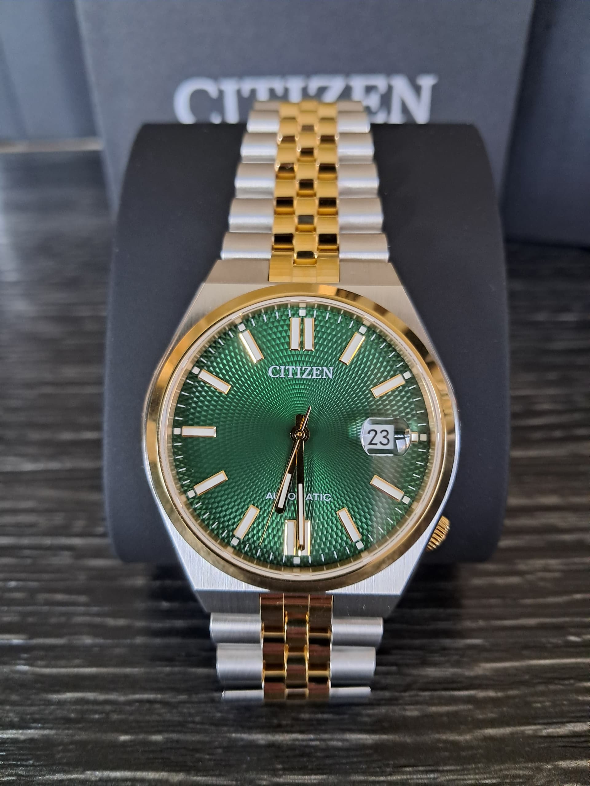 Mevrouw Kida had deze helemaal zonder hints van mij uitgezocht. Een prima keuze al zeg ik het zelf. De groene wijzerplaat en de goud kleur in de band en bezel geven het horloge een extra feestelijk tintje .