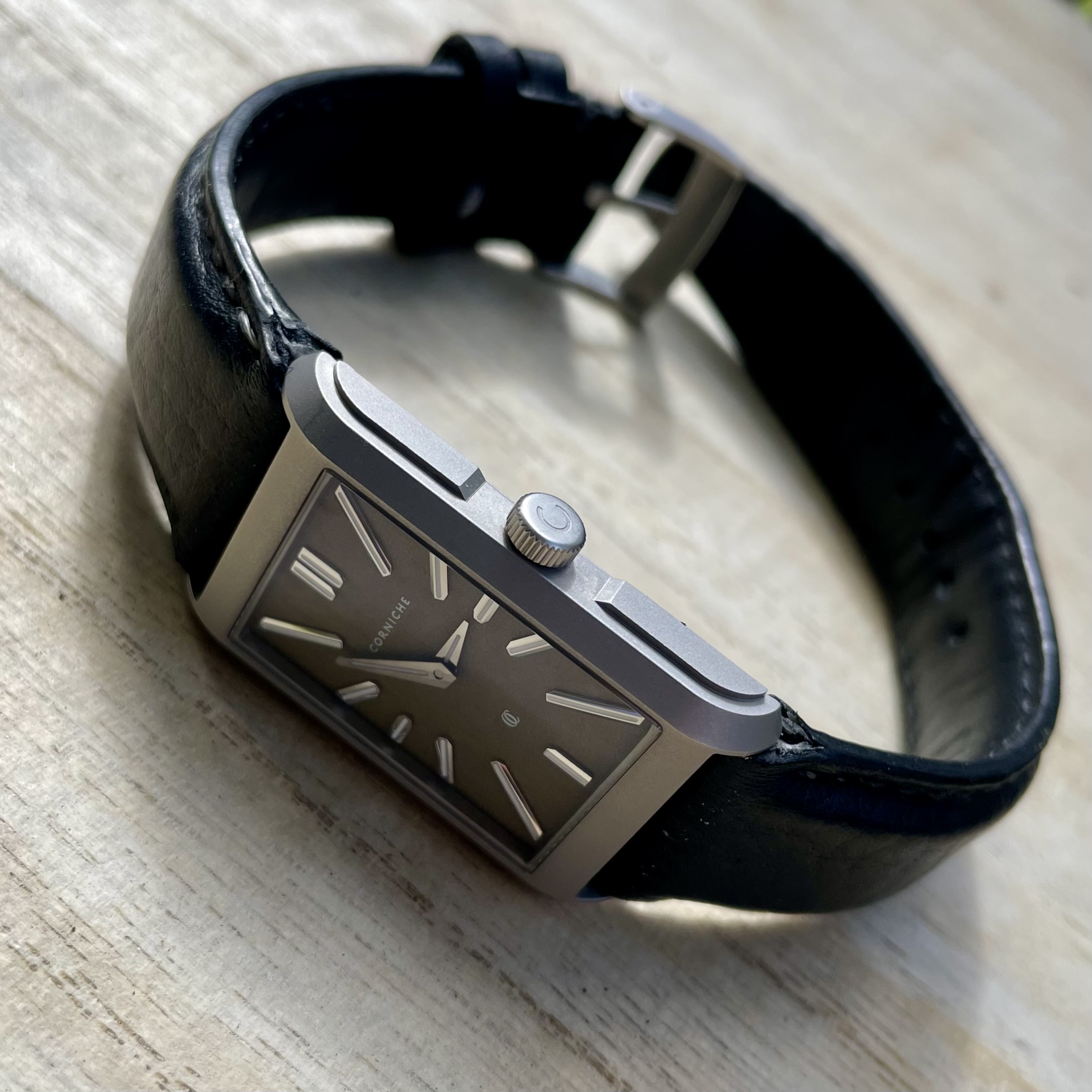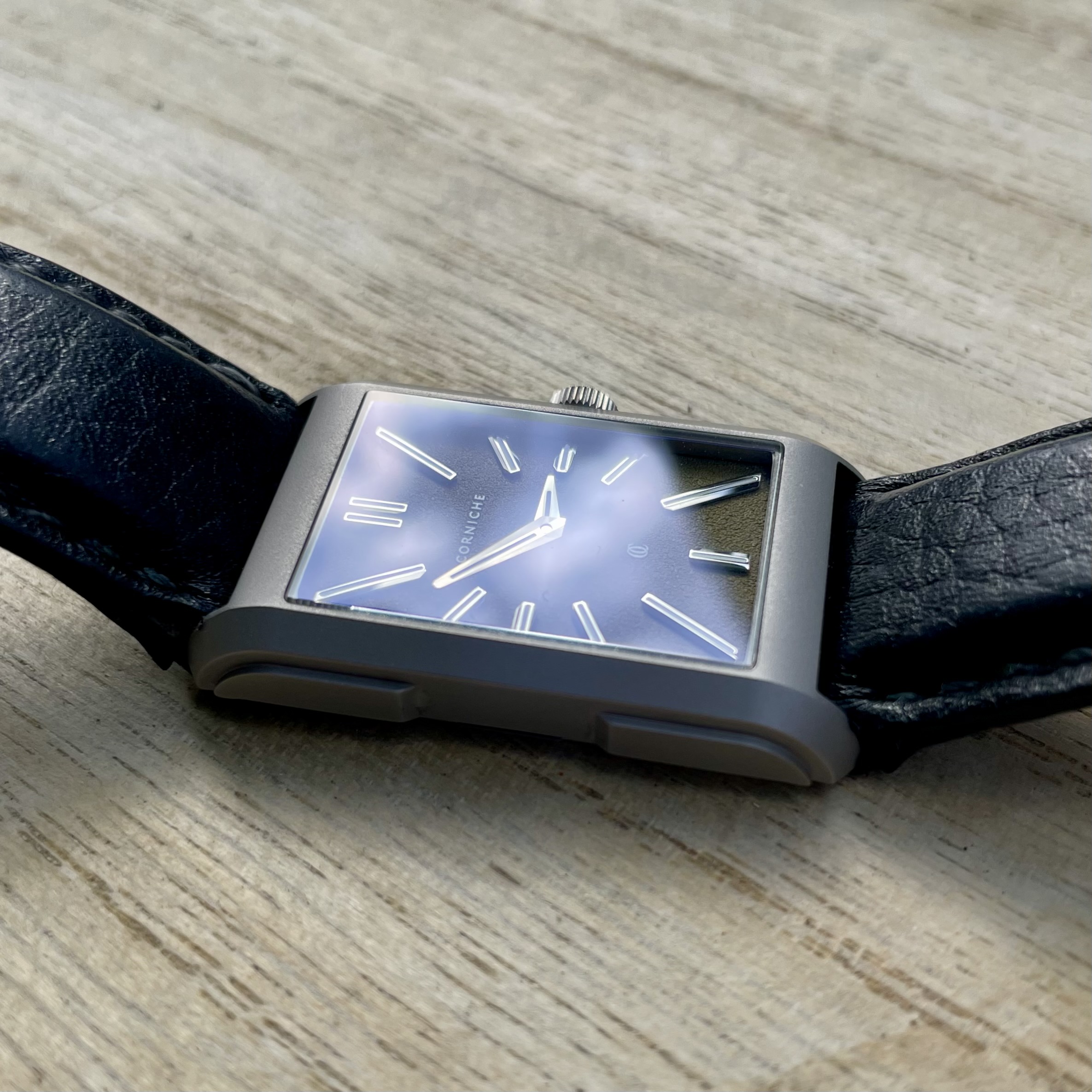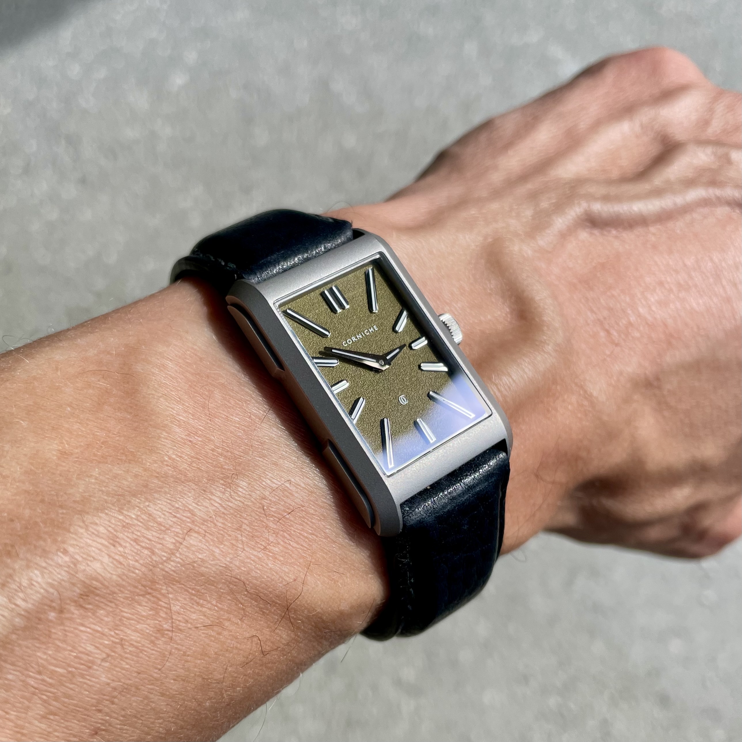 Na ooit een Cartier tank Solo te hebben gehad, ben ik een grote fan gebleven van het tank model. Altijd chique, volgens klassieke begrippen sportief en meestal bescheiden van formaat en in aanwezigheid. Kanttekening vind ik wel altijd de beperkte waterdichtheid. Niet dat je ermee gaat zwemmen, maar toch wat als je weer eens door een flinke hoosbui loopt. De afleesbaarheid aangezien wijzerplaat en wijzers doorgaans wat kleiner zijn. En dan het prijssegment. Diverse courante merken brengen een tank uit, maar eigenlijk blijf ik automatisch altijd alles tegen de lat van Cartier en JLC leggen. En dan kom je ergens online een Corniche Visionnaire OC Limited Editie tegen ![]()
