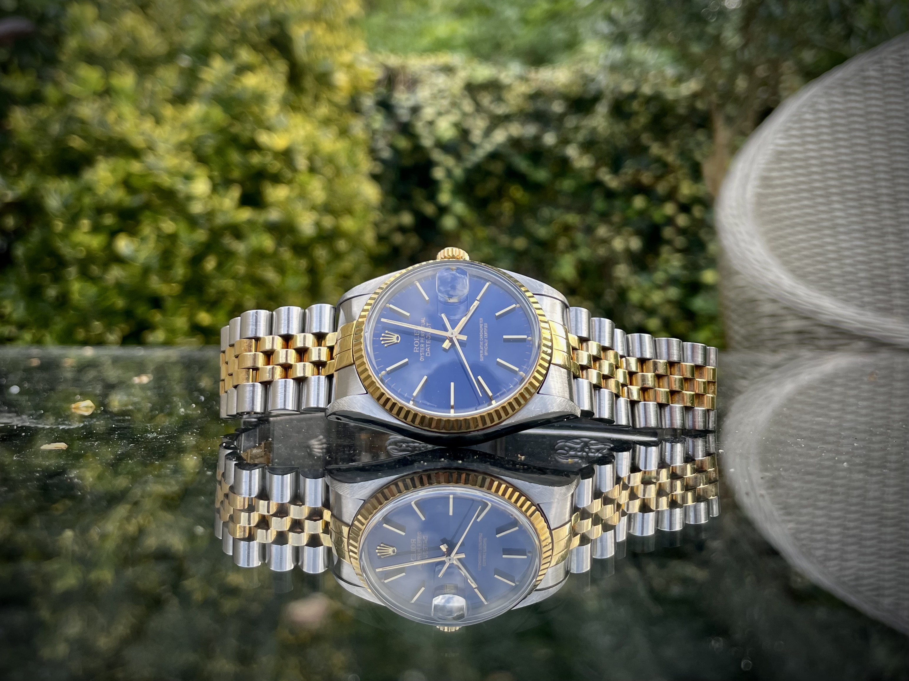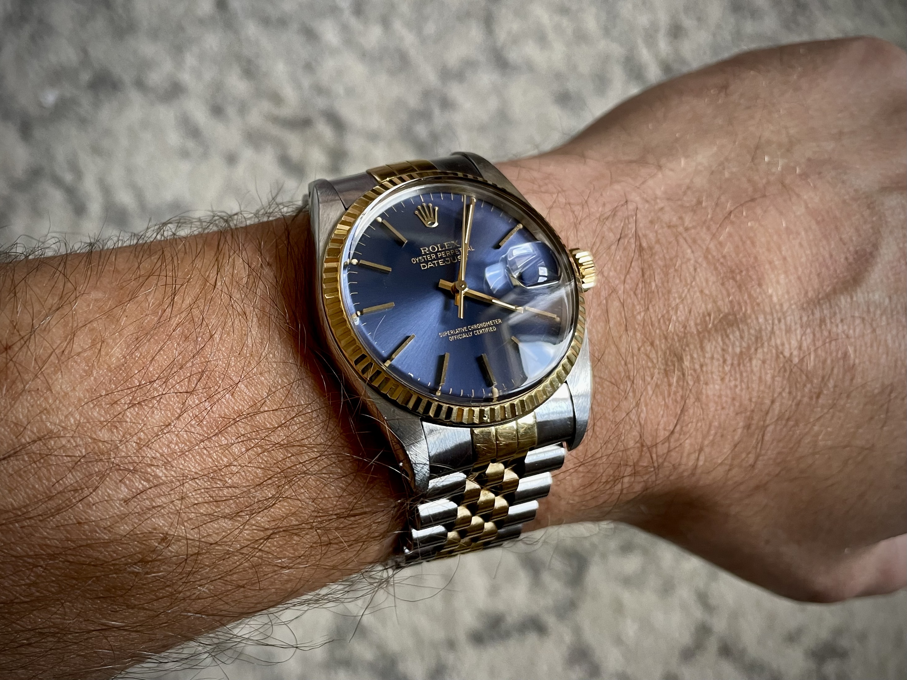 En daar was die. Niet zomaar een Rolex. Maar mijn Rolex. De perfecte combinatie die ik altijd echt wilde: two tone, blauwe plaat. Ik heb er eerder een Orient hommage van gemod.