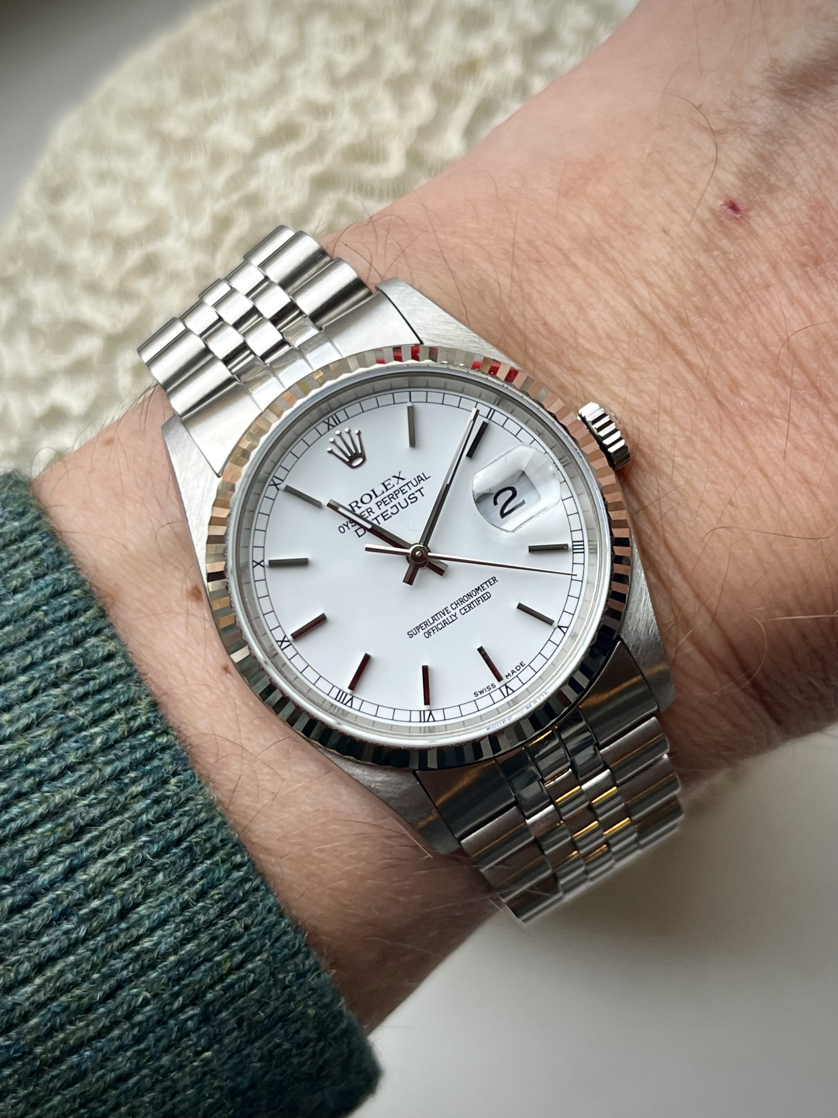De 36mm Datejust heb ik nooit als een klein horloge ervaren als ik ‘m bij iemand anders om de pols zag, en ook niet toen ik ‘m in de etalage bewonderde. In de hand leek de Datejust vrij klein, maar om de pols verdween dit gevoel en was hij echt perfect!