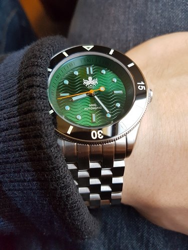 Sinds ik in 2018 de groene Wavemaster had gekocht, ben ik fan van Phoibos. In mijn verzameling heb ik ook nog de blauwe PY007. Het zijn heel erg mooi afgewerkte kwaliteitshorloges voor weinig geld. En ik vind het logo cool