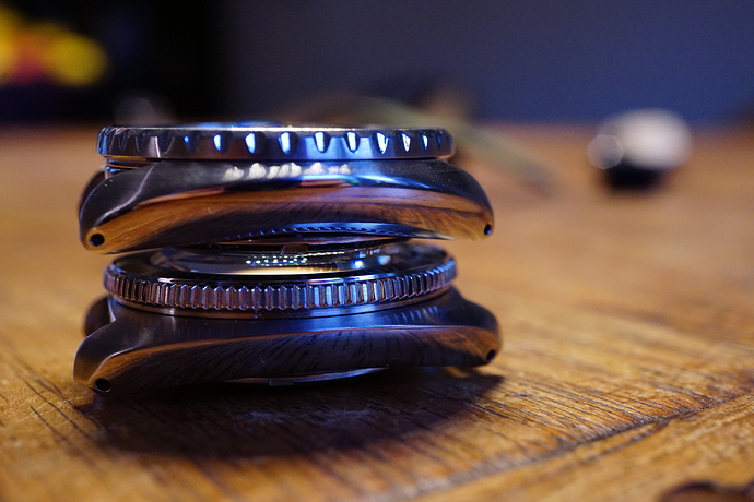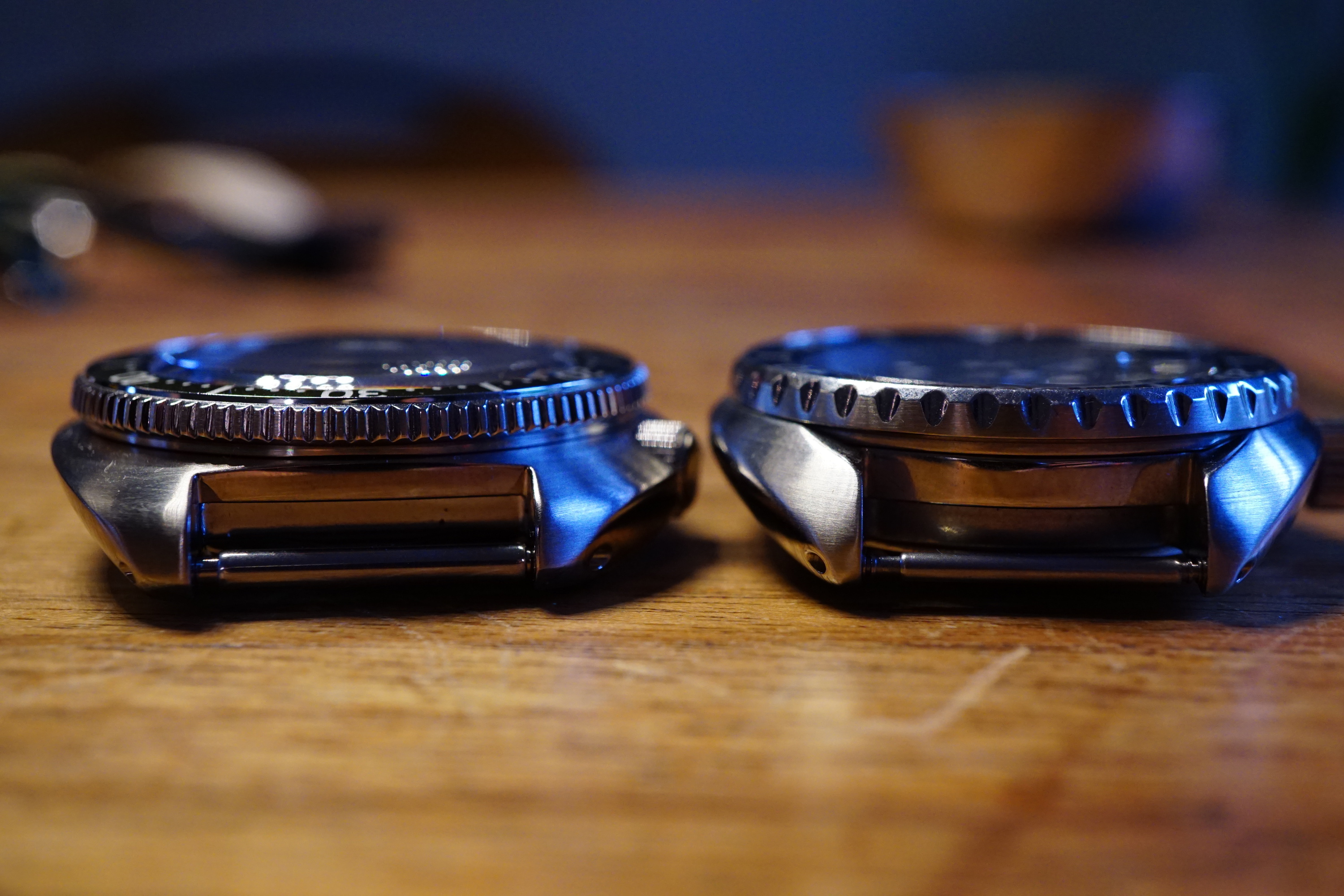 Wat we ook zien is dat de bezel van de Uemura iets lager uitvalt, en dat de iets grotere dikte (0,2mm) met name door het heerlijk gebolde saffiertje komt.