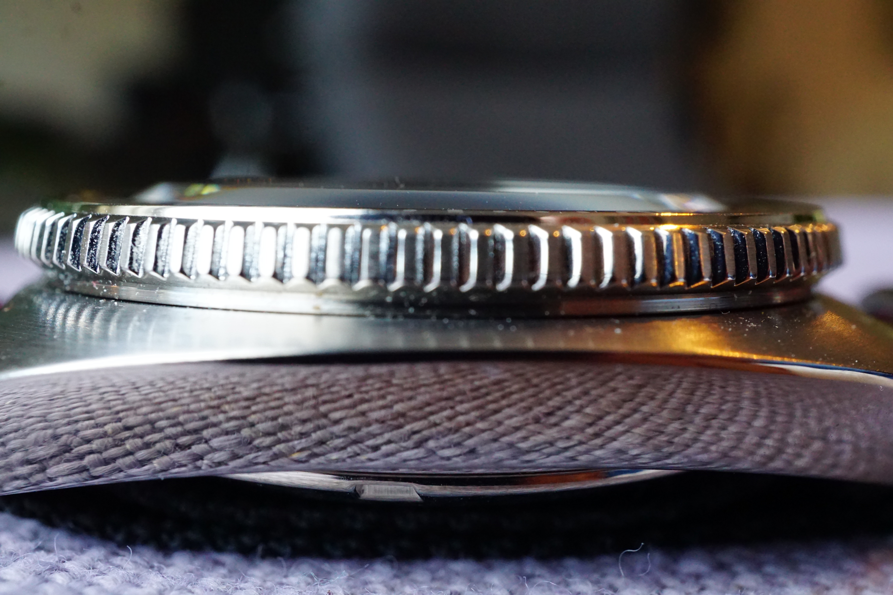 De bezel is een bijzonder fijn roterende coin edge geworden. Da’s ook een welkome verandering ten opzichte van grovere bezels, hij speelt daarmee bijna in dezelfde klasse van discretie als m’n andere favoriete duiker, de Squale 1521 Azuur.