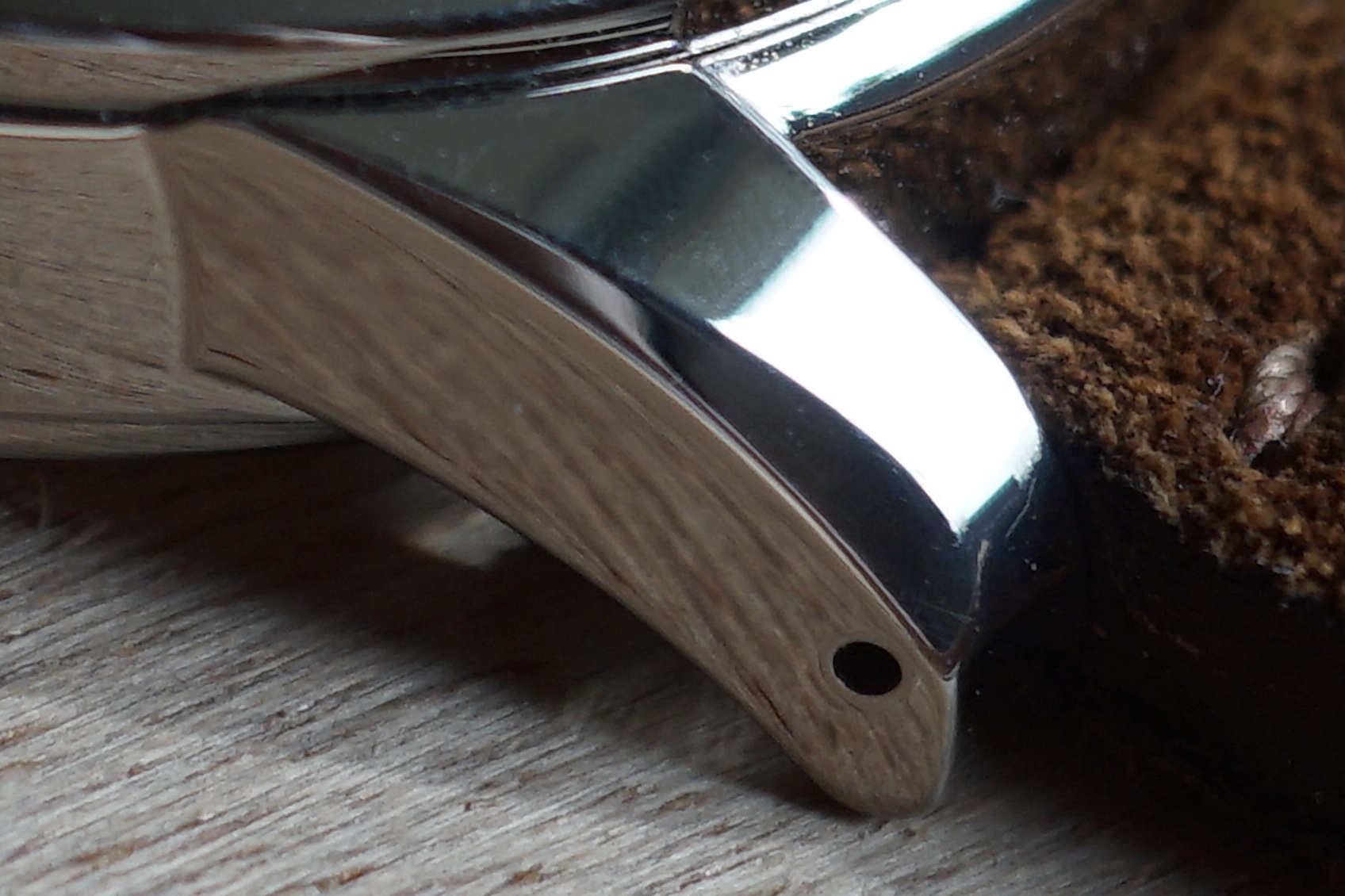 Handmatig Zaratsu gepolijst uiteraard en te verwachten zou zijn, dat het daardoor als zeer glimmend wordt ervaren maar dat is voor mij niet het geval. De kast straalt daardoor juist een welkome rust uit en is daarmee in overeenstemming met de wereld achter het glaasje. Overigens, vanaf de zijkant bekeken, is de kast ingeklemd tussen de bezel en het achterdeksel, hetgeen ik een prachtige constructie vind.