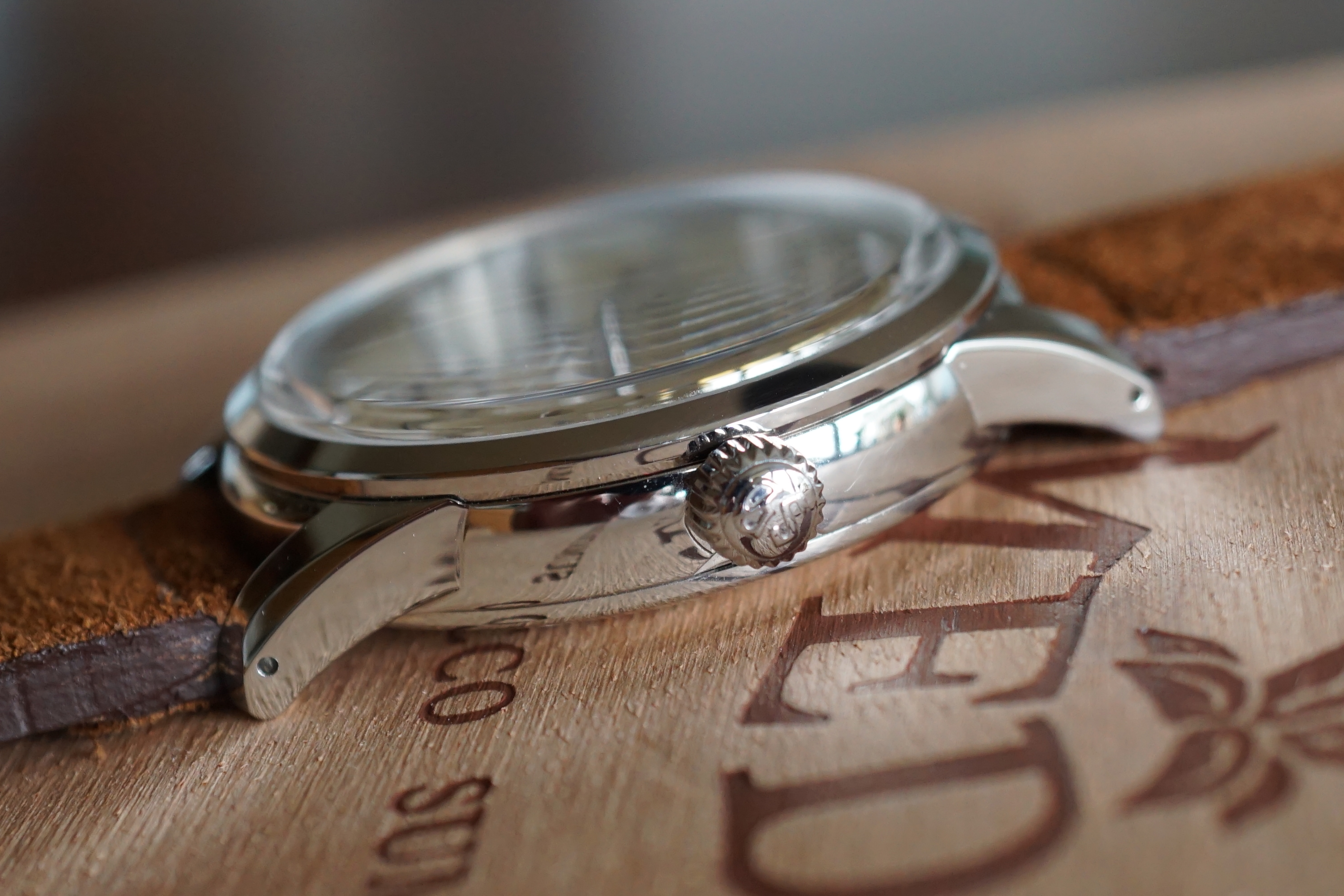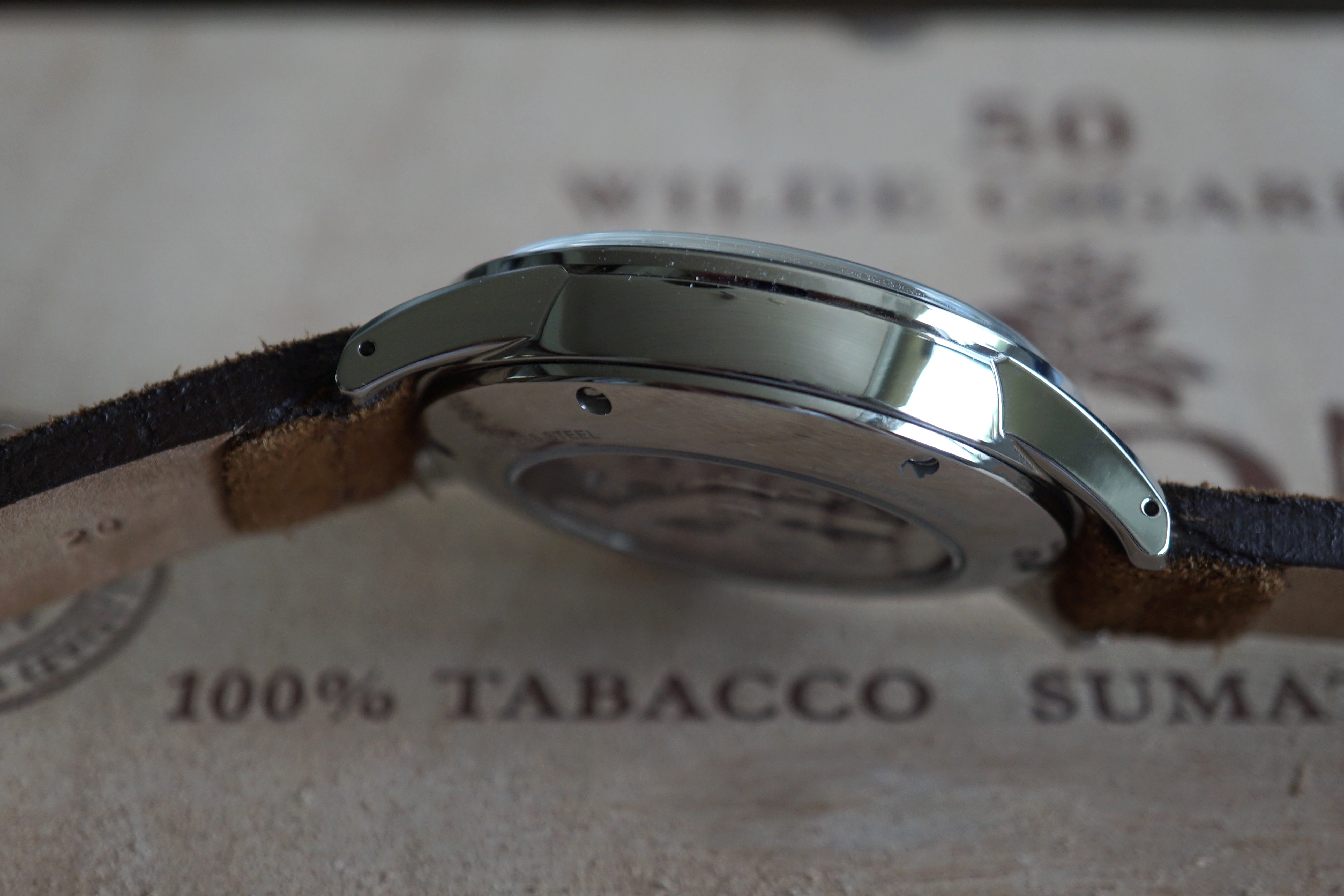 De facetten aan de bovenkanten van de lugs zijn asymmetrisch uitgevoerd, waardoor de lugs er optisch smaller uitzien dan ze werkelijk zijn. Verder zijn alle overgangen tussen lugs en kast geaccentueerd, waardoor het lijkt alsof de lugs naderhand tegen de kast zijn gehardsoldeerd. Erg fraai gedaan en even ter uwer informatie beste lezer, op het handje gepolijst uiteraard.