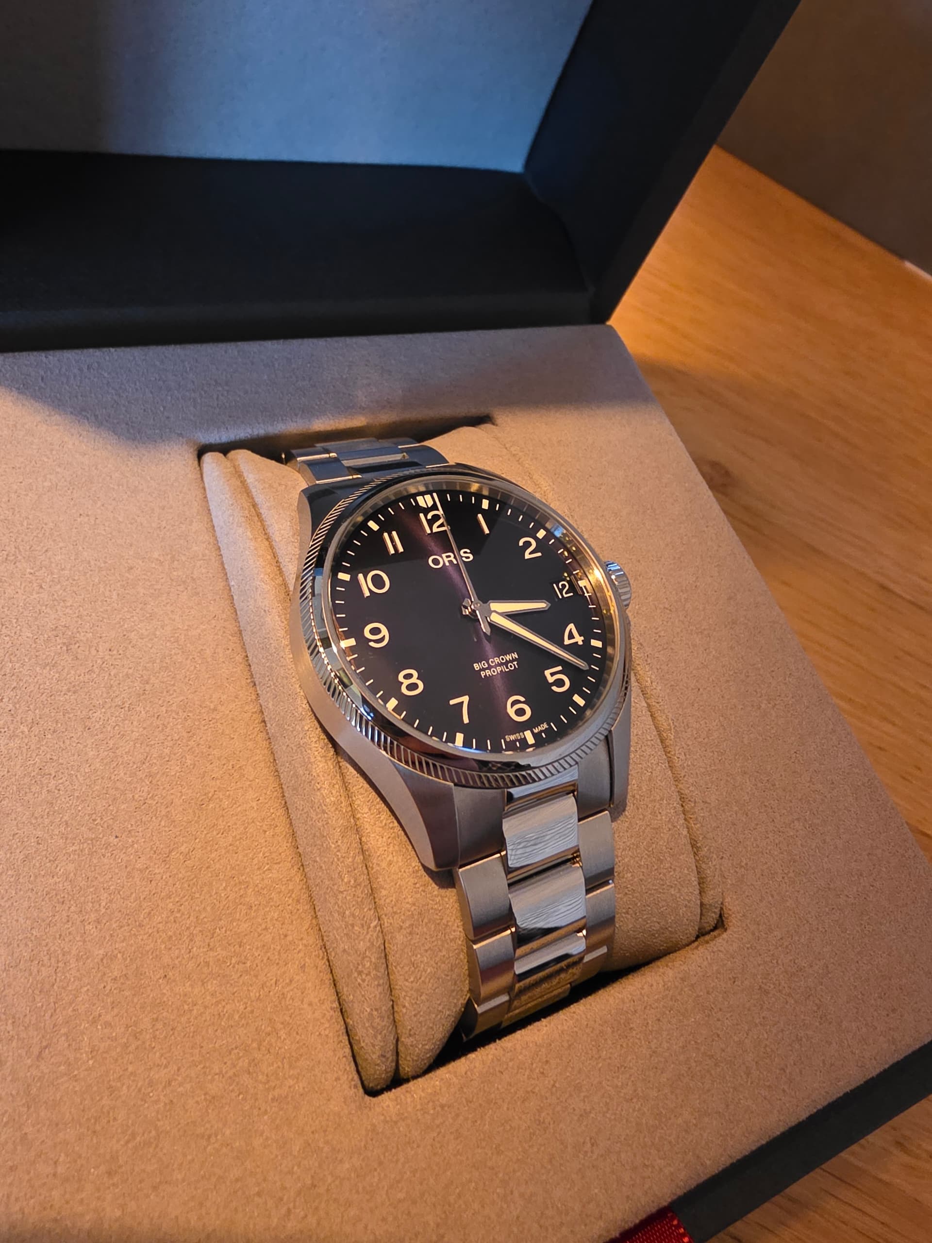 Mijn ongeduldige geest bleef echter lezen, filmpjes kijken, en kwam geheel toevallig op de website van een kleine juwelier ergens in het zuiden van het land. En warempel; daar liep een uitverkoop van een Oris ‘soort van flieger’ die eerder de shortlist had gepasseerd. De creditcard gegevens vulden zichzelf in, zoals dat tegenwoordig gaat ‘dankzij’ de tech giganten die ons leven besturen, en de Oris Pro Pilot was onderweg. De Citizen deal werd afgeblazen, en ik was in afwachting van de volgende NA: