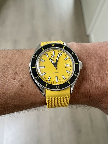 Dat klopt inderdaad, maar die oranje die ik had was van een Seiko SRPD en die oranje kleur kun je gewoon niet vergelijken met de oranje kleur van de Doxa. Wat een intense kleur is dit zeg. Mooi maar ingetogen en niet schreeuwerig, maar dan wel op staal, want je kunt ook een rubberstrap erbij doen, maar dan wordt het wel erg oranje en niet geheel onbelangrijk: 250 euro voor een stukkie rubber gaat mij toch wat te ver