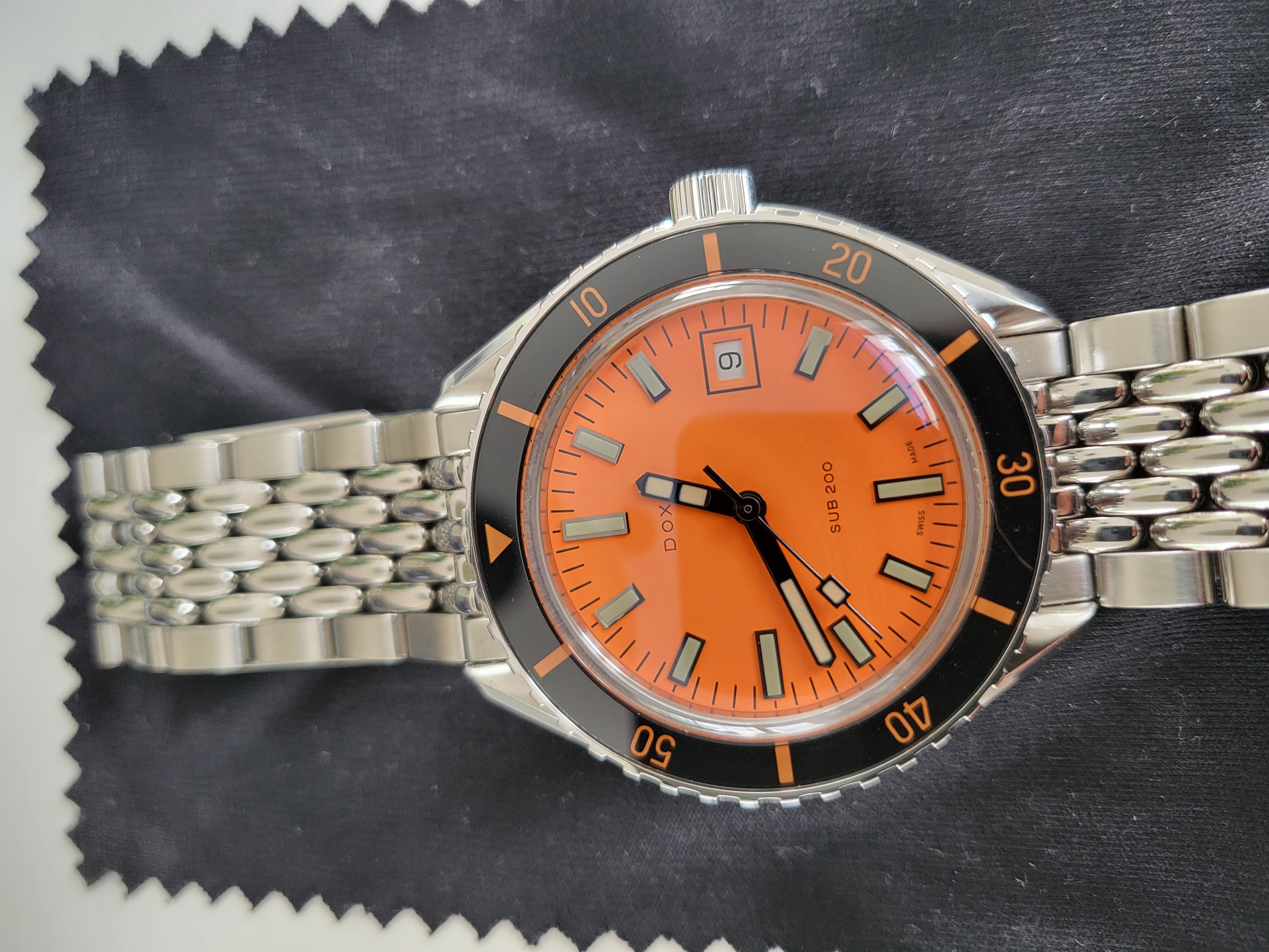 De Sub 200 in het oranje moest er dus komen. Nu wilde het toeval dat ik op HF las dat iemand een mooi horloge had aangeschaft bij Jaap @SuperC van Ten2Two, dus daar even een blik geworpen en zowaar had Jaap er eentje te koop staan. Deal was dus snel gemaakt en eenmaal in huis werd ik verrast door de heldere kleur van de dial en de algemene afwerking van het horloge. Ik weet dat dit de “budget” Doxa is voor velen, maar ik ben onder de indruk hoor. Nieuw kost deze bijna 1000 pegels op staal en dat is serieus geld voor de doorsnee horloge liefhebber, maar je krijgt er wel wat moois en aparts voor.