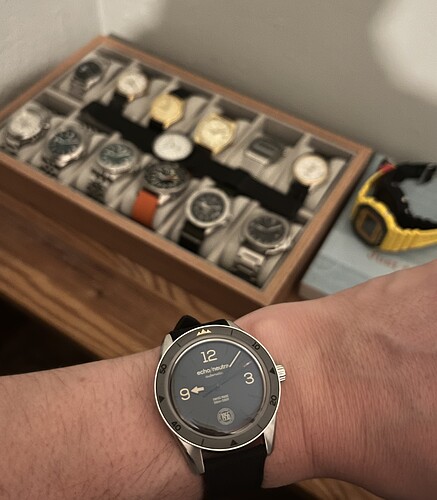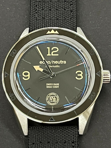 Echo/Neutra is een Italiaans microbrand merk met leuke horloges in de collectie. Onder de kap zit een Selita SW200-1 verstopt wat bij vrijwel iedereen hier wel bekend is. Het glas is boxed shaped dus deze steekt mooi uit boven de bezel.