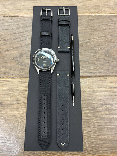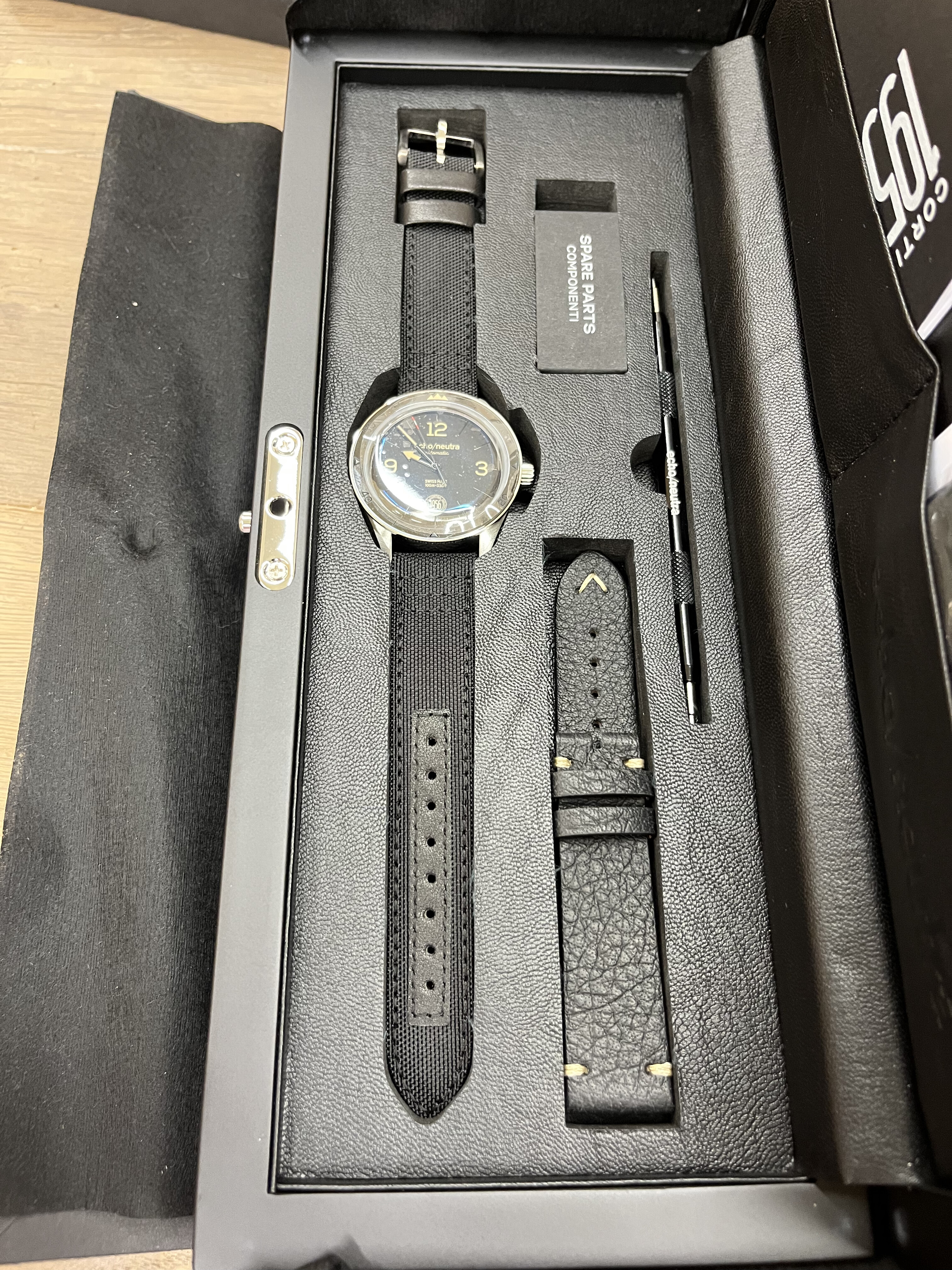 Verder zitten er 2 horlogebanden bij. De ene is een zwarte tropic welke er standaard op zit. En de andere een zwarte lederen met een vintage look. Erg gaaf en passend bij dit type horloge. Ook zit er nog een mooie tool bij. Zal ik niet gebruiken aangezien ik net een Bergeon binnen heb gekregen. Ook zit er een extra sluiting bij, erg handig.