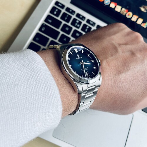 De stalen band is denk een van de meest comfortabele banden die ik ooit om mijn pols heb gehad en met drie standen quick adjust zit hij altijd goed. Ik krijg geen genoeg van de prachtige blauwe sunburst wijzerplaat die donkerder wordt bij de rand, waar de diamant geslepen, rhodium gelaagde, opgelegde indexen oplichten bij het minste licht alsof ze zaratsu gepolijst zijn.