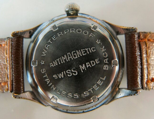 Een duidelijk flink gedragen verchroomd kastje met een wat dof en gekrast glas, een lelijk bandje en een gekraste achterdeksel. Maar ook met een vrijwel gave wijzerplaat, mooi verkleurde lume cijfertjes en geblauwde wijzertjes waar ook de verkleurde en uitgewerkte lume nog in zat. Radium? Zou zo maar kunnen. Voorzichtig er aan werken dus. Ik ben niet al te fanatiek met radium, geen mondkapje maar wel veel handen wassen enzo.Op mijn leeftijd zal de inwerking van dat beetje ouwe radium verder wel meevallen… Het kroontje zag er nog goed uit en oh ja, als kers op de taart een rode seconden wijzer!