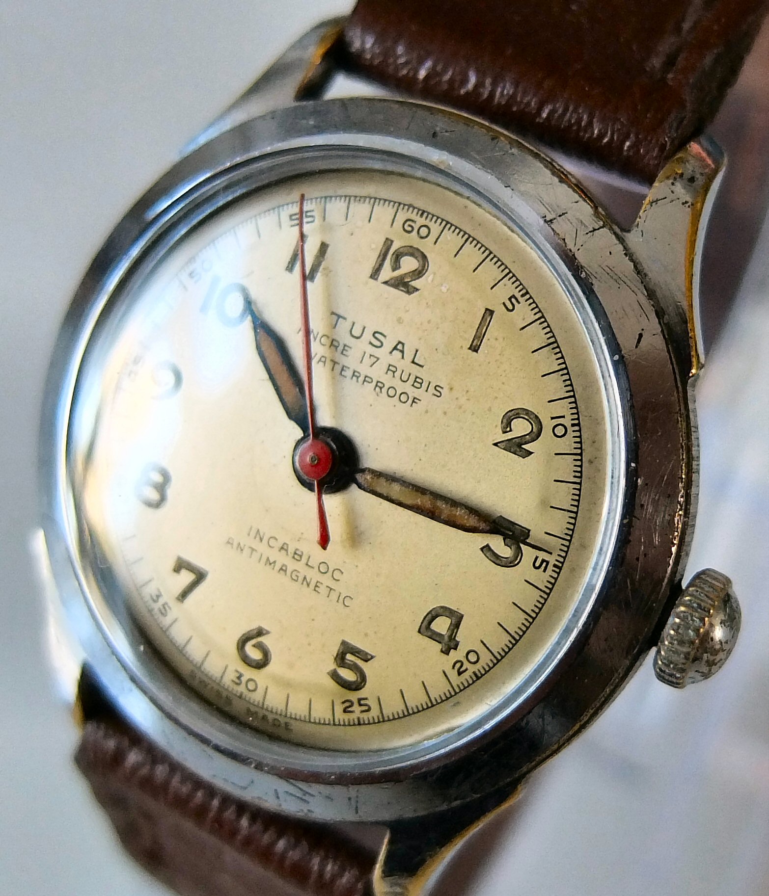 Tusal. Als je hier op het forum deze naam in de zoekfunctie invult krijg je best wel een aantal vermeldingen, maar weinig antwoorden. Volgens sommigen was Tusal in de jaren '50 en '60 een behoorlijk bekend merk en van behoorlijke kwaliteit omdat diverse vermeldingen echt (14K) gouden hourloges beschrijven. Ook Google laat als je op afbeeldingen zoekt behoorlijk wat horloges zien, de meesten uit de jaren '50 en '60 en ook daar zie je opvallend veel gouden en zilveren exemplaren. Als je echter naar documentatie gaat zoeken is er bedroevend weinig resultaat. Good old Mikrolisk geeft niet thuis en verder heb ik ook geen andere beschrijving of vermelding kunnen vinden die informatie verschaft over de herkomst of geschiedenis van het merk. De referenties via Google zijn allemaal (meestal al lang verlopen) verkoop-aanbiedingen van diverse veiling sites en daar wordt je, behalve af en toe een vermelding van het uurwerk wat er in zit en/of een bouwjaar indicatie (meestal rond de jaren '50 - '60) ook niet veel wijzer. Vandaar: een ‘mystery brand’. Ik had al eens eerder een Tusal in mijn verzameling, maar omdat ik die niet zo interessant vond heb ik die al weer een paar jaar geleden verkocht (via HF? weet het niet meer…) Achteraf gezien eigenlijk best wel een mooi klokje, maar je kunt niet alles vasthouden…