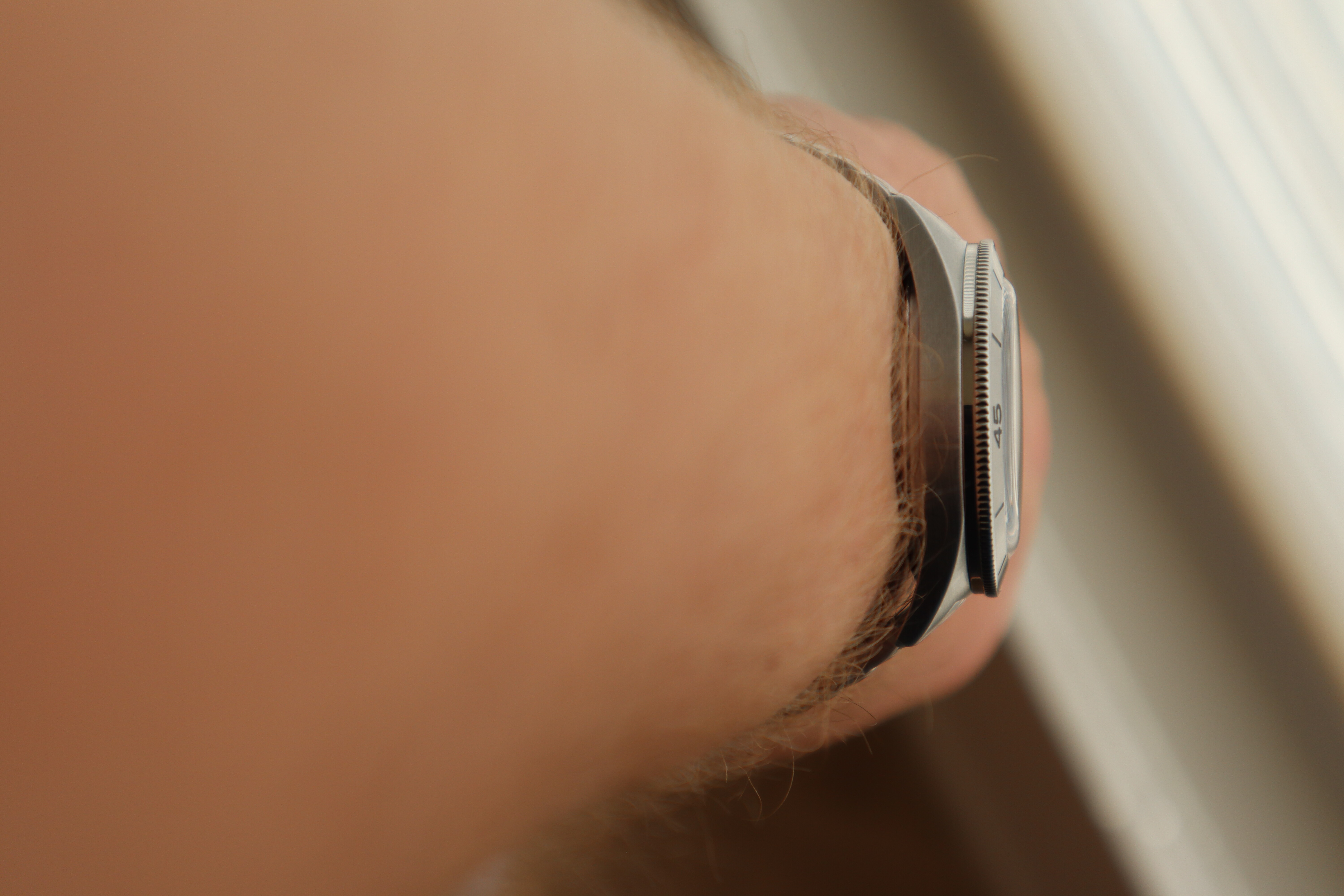 De lug-to-lug van 45mm maakt dat niet te aanwezig is en de lugs zelf buigen wat naar onder af waardoor hij heel fijn op mijn pols komt te liggen.