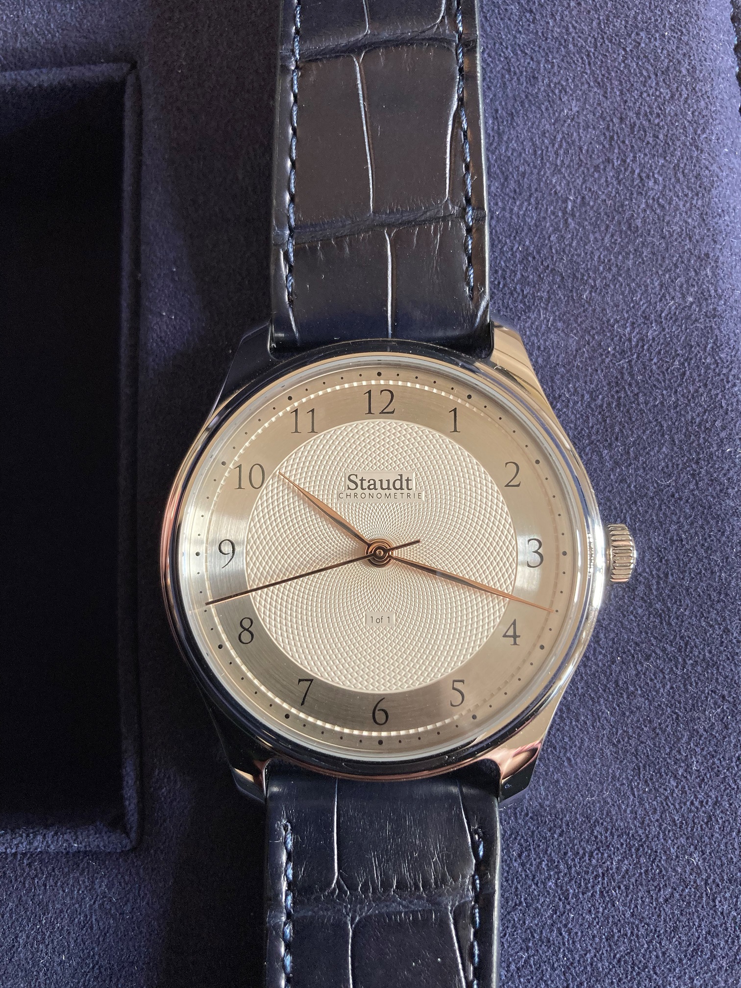 En toen zat ik op dit forum te browsen en zag een merk wat meerdere keren voorbij was gekomen. Staudt zag er leuk uit, die automaat met blauwe wijzerplaat. Zou ik die toevoegen aan mijn collectie? Op de website stond nog meer leuks, een hele mooie Chronograaf met een handgemaakte Guilloche wijzerplaat. Wat een plaatje om te zien. Alleen ik heb wel eens een chronograaf geprobeerd, maar wordt altijd een beetje tureluurs van de wijzers. Ze leiden me altijd een beetje teveel af van de primaire functie; de tijd aflezen. Niet erg als het horloge af en toe gedragen wordt, maar dit zou ik toch meer kopen voor mijzelf? Dus nee.