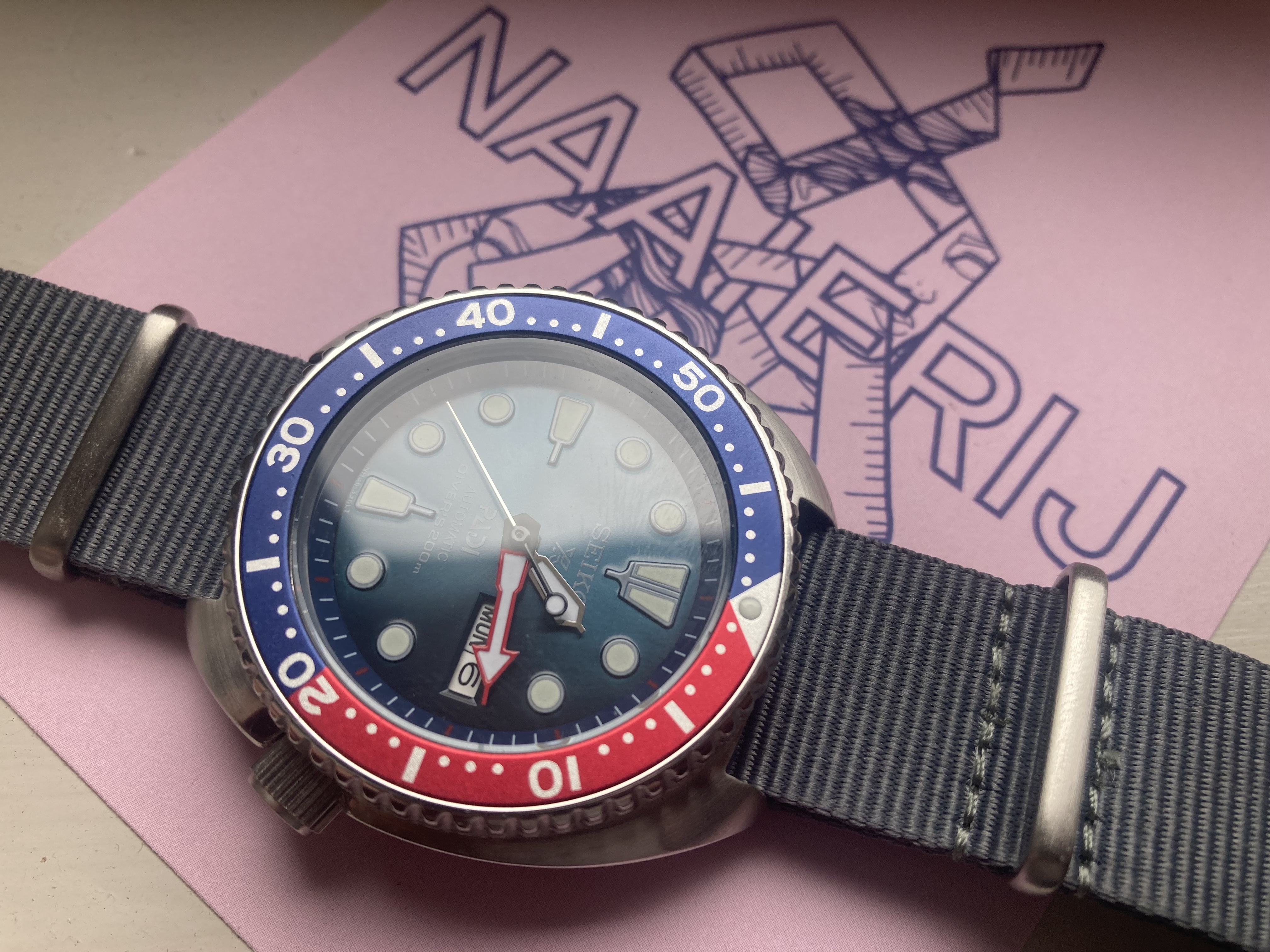 Enfin, in ieder geval wel leuk kennis kunnen maken met de vorm en dimensies van de Turtle (vielen helemaal niet tegen, trouwens, ondanks dat het toch een maatje groter is dan de SKXp en de achterkant van Marktplaats. In het kader van gewaarschuwde mensen die voor twee tellen: let bij het kopen van turtles vooral of de kroon klopt. Een andere dead giveaway is de lume pip en dat er ‘NH36’ op de wijzerplaat staat in plaats van 4R36 op de index op 6 uur.